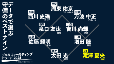 ●月別に探す 2025.12 【ユーティリティ部門】データで選ぶ守備のベストナイン “デルタ・フィールディング・アワード2025” 【右翼手部門】データで選ぶ守備のベストナイン “デルタ・フィールディング・アワード2025” 【中堅手部門】データで選ぶ守備のベストナイン “デルタ・フィールディング・アワード2025” 【左翼手部門】データで選ぶ守備のベストナイン “デルタ・フィールディング・アワード2025” 【遊撃手部門】データで選ぶ守備のベストナイン “デルタ・フィールディング・アワード2025” 【三塁手部門】データで選ぶ守備のベストナイン“デルタ・フィールディング・アワード2025” 2025.11 【二塁手部門】データで選ぶ守備のベストナイン “デルタ・フィールディング・アワード2025” 【一塁手部門】データで選ぶ守備のベストナイン “デルタ・フィールディング・アワード2025” 【捕手部門】データで選ぶ守備のベストナイン “デルタ・フィールディング・アワード2025” ドジャースは金持ちだから強いのか 選手の力引き出す総合力こそ武器 1.02のバージョン履歴 データ視点で選ぶ守備のベストナイン “デルタ・フィールディング・アワード2025”受賞選手発表 2025.10 又吉克樹は「まだやれる」もなぜ戦力外? ホークスの“特殊事象”を示す「4回」とは 【2026年】1.02新球種トラッカー リーグV導いた海野隆司の「0/287」 後半戦は“甲斐超え”12球団トップ…示した劇的進化 アーロン・ジャッジとカル・ローリー、大リーグ空前のMVP争い ドラゴンズは創価大・立石を狙うべきなのか? データから考える2025年ドラフト戦略 2025.09 牧原大成の好調を徹底分析 球史でも特異すぎる“超積極性”…12球団断トツの「.391」 セ・リーグが2027年からDH制採用、恩恵受けるのは強打のレフト? 打率.223まで低下もセイバー目線では新人王筆頭 石伊雄太はなぜこれほど評価が高いのか 2025.08 “藤松杉”が捉える史上最強トリオの可能性 SBMをも凌駕…伝説の「JFK」超えも視野に セーフティバントの有効性を検証する 「勝利投手」の称号に意味はあるか 真の能力見る機運の醸成を 未勝利・金丸夢斗は新人王最有力阪神・伊原より優秀? それどころかセ・リーグ上位クラスの投手だ 主力の復帰時期は適切か 栗原&近藤に見える“明らかな代償”…昨季比マイナス75.3点の衝撃 2025.07 野村勇は“穴埋め”にとどまらない データが示す「希少性」…坂本勇人以来の大記録も射程圏内 プロ野球「駆け込み補強」活発 現有戦力の体調維持も重要 松山晋也はすでにライデル超え NPB141投手中トップの“29.4%”とは? 2025.06 柳町達の覚醒示す“2つの変化” 苦手克服「1.097」の衝撃…近藤健介と重なる指標 外野最後の一枠を射止められるか 俊足を攻守に活かしはじめた尾田剛樹 巨人移籍後も不振に苦しむ“二軍の帝王”リチャード。成績改善へ向けてかすかな希望を感じさせる「変化の兆し」とは? 2025.05 一見、物足りない成績に思えても実は...“20年に一人の逸材”楽天・宗山塁の「トータルバランス力」はすでに遊撃手屈指 主力離脱だけではない…3、4月の低迷招いた「9.4%」 リーグ1位→ワーストに転落した“ここぞの力” プロ野球、主力の穴埋めるならベテランより20代 評価指標が示す起用法 支配下「残り3枠」の有力候補は? 過去の昇格例に共通…勝敗&防御率より“重要な2つの指標” なぜ主力級野手が3巡目まで残ってしまうのか? WARで読み解くNPBドラフト戦略 打つべきを打ち、見送るべきを見送る 「判断力」が向上した鵜飼航丞は竜打線の救世主となるか 2025.04 近藤健介の離脱はどれだけ痛い? データが示す貯金減少”…重すぎる「7.0&.863」 「魚雷バット」が切り開く地平 道具の最適化探る時代に UZRは隣のポジションの守備力に本当に影響されないのか? 柳田悠岐は44歳でも1軍戦力 自ら口にする“あと2年”の勿体なさ…38歳でも驚異の「.735」 2025.03 「球場の差」をなくしてみると⋯? 実は「侍JAPAN級」だった福永裕基 DELTAアナリストによる2025年順位予想 ~セ・リーグ編~ DELTAアナリストによる2025年順位予想 ~パ・リーグ編~ トレバー・バウアー日本球界復帰、DeNAの運用法は? 【ver.2.5.0】1.02データ集計ロジックのアップデートについて 2025.02 “甲斐キャノン”は本当に凄かったのか…正捕手候補の強みと弱み 突きつけられた「0.08」 対戦増加は投手に不利 打者の「慣れ」こそ真の敵 ストライク振らず→打撃改善の“謎” データで丸わかり…今宮健太の激変した打席での戦略 上沢直之が米国で苦しんだ“一因” スタイル豹変…激少割合「9.6%」は正解か? 2025.01 由伸&戸郷に肉薄…前田悠伍が示した絶対的エースの資質 過去10年でトップ3の“衝撃” イチローさんが憂う野球の未来 データと感性は共存可能 【データ検証】三森⇔浜口、ホークスの勝算は? 低迷理由が判明…球団判断に納得の“証拠”