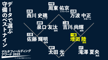 ●月別に探す 2025.11 【一塁手部門】データで選ぶ守備のベストナイン “デルタ・フィールディング・アワード2025” 【捕手部門】データで選ぶ守備のベストナイン “デルタ・フィールディング・アワード2025” ドジャースは金持ちだから強いのか 選手の力引き出す総合力こそ武器 1.02のバージョン履歴 データ視点で選ぶ守備のベストナイン “デルタ・フィールディング・アワード2025”受賞選手発表 2025.10 又吉克樹は「まだやれる」もなぜ戦力外? ホークスの“特殊事象”を示す「4回」とは 【2026年】1.02新球種トラッカー リーグV導いた海野隆司の「0/287」 後半戦は“甲斐超え”12球団トップ…示した劇的進化 アーロン・ジャッジとカル・ローリー、大リーグ空前のMVP争い ドラゴンズは創価大・立石を狙うべきなのか? データから考える2025年ドラフト戦略 2025.09 牧原大成の好調を徹底分析 球史でも特異すぎる“超積極性”…12球団断トツの「.391」 セ・リーグが2027年からDH制採用、恩恵受けるのは強打のレフト? 打率.223まで低下もセイバー目線では新人王筆頭 石伊雄太はなぜこれほど評価が高いのか 2025.08 “藤松杉”が捉える史上最強トリオの可能性 SBMをも凌駕…伝説の「JFK」超えも視野に セーフティバントの有効性を検証する 「勝利投手」の称号に意味はあるか 真の能力見る機運の醸成を 未勝利・金丸夢斗は新人王最有力阪神・伊原より優秀? それどころかセ・リーグ上位クラスの投手だ 主力の復帰時期は適切か 栗原&近藤に見える“明らかな代償”…昨季比マイナス75.3点の衝撃 2025.07 野村勇は“穴埋め”にとどまらない データが示す「希少性」…坂本勇人以来の大記録も射程圏内 プロ野球「駆け込み補強」活発 現有戦力の体調維持も重要 松山晋也はすでにライデル超え NPB141投手中トップの“29.4%”とは? 2025.06 柳町達の覚醒示す“2つの変化” 苦手克服「1.097」の衝撃…近藤健介と重なる指標 外野最後の一枠を射止められるか 俊足を攻守に活かしはじめた尾田剛樹 巨人移籍後も不振に苦しむ“二軍の帝王”リチャード。成績改善へ向けてかすかな希望を感じさせる「変化の兆し」とは? 2025.05 一見、物足りない成績に思えても実は...“20年に一人の逸材”楽天・宗山塁の「トータルバランス力」はすでに遊撃手屈指 主力離脱だけではない…3、4月の低迷招いた「9.4%」 リーグ1位→ワーストに転落した“ここぞの力” プロ野球、主力の穴埋めるならベテランより20代 評価指標が示す起用法 支配下「残り3枠」の有力候補は? 過去の昇格例に共通…勝敗&防御率より“重要な2つの指標” なぜ主力級野手が3巡目まで残ってしまうのか? WARで読み解くNPBドラフト戦略 打つべきを打ち、見送るべきを見送る 「判断力」が向上した鵜飼航丞は竜打線の救世主となるか 2025.04 近藤健介の離脱はどれだけ痛い? データが示す貯金減少”…重すぎる「7.0&.863」 「魚雷バット」が切り開く地平 道具の最適化探る時代に UZRは隣のポジションの守備力に本当に影響されないのか? 柳田悠岐は44歳でも1軍戦力 自ら口にする“あと2年”の勿体なさ…38歳でも驚異の「.735」 2025.03 「球場の差」をなくしてみると⋯? 実は「侍JAPAN級」だった福永裕基 DELTAアナリストによる2025年順位予想 ~セ・リーグ編~ DELTAアナリストによる2025年順位予想 ~パ・リーグ編~ トレバー・バウアー日本球界復帰、DeNAの運用法は? 【ver.2.5.0】1.02データ集計ロジックのアップデートについて 2025.02 “甲斐キャノン”は本当に凄かったのか…正捕手候補の強みと弱み 突きつけられた「0.08」 対戦増加は投手に不利 打者の「慣れ」こそ真の敵 ストライク振らず→打撃改善の“謎” データで丸わかり…今宮健太の激変した打席での戦略 上沢直之が米国で苦しんだ“一因” スタイル豹変…激少割合「9.6%」は正解か? 2025.01 由伸&戸郷に肉薄…前田悠伍が示した絶対的エースの資質 過去10年でトップ3の“衝撃” イチローさんが憂う野球の未来 データと感性は共存可能 【データ検証】三森⇔浜口、ホークスの勝算は? 低迷理由が判明…球団判断に納得の“証拠” 2024.12 “生のデータ”で明らかにする周東佑京「実際の速さ」 2位に大差…衝撃記録「81回」 「抑え」は「先発」に及ばず プロ野球・投手陣の貢献度 今季の補殺数はわずか「3」…それでも近藤健介の送球能力が“万波級”である理由 三浦瑞樹、仲田慶介はなぜ戦力外? 議論呼ぶ通告も…物語る球団の“データ分析力 2024.11 【捕手部門】データで選ぶ守備のベストナイン “デルタ・フィールディング・アワード2024” 【一塁手部門】データで選ぶ守備のベストナイン “デルタ・フィールディング・アワード2024” 【二塁手部門】データで選ぶ守備のベストナイン “デルタ・フィールディング・アワード2024” 【三塁手部門】データで選ぶ守備のベストナイン “デルタ・フィールディング・アワード2024” 【遊撃手部門】データで選ぶ守備のベストナイン “デルタ・フィールディング・アワード2024” 【左翼手部門】データで選ぶ守備のベストナイン 
