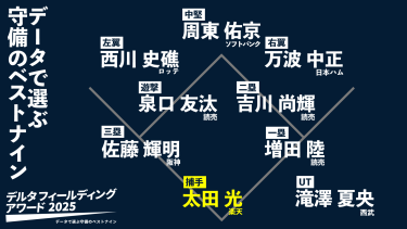 ●月別に探す 2025.11 【捕手部門】データで選ぶ守備のベストナイン “デルタ・フィールディング・アワード2025” ドジャースは金持ちだから強いのか 選手の力引き出す総合力こそ武器 1.02のバージョン履歴 データ視点で選ぶ守備のベストナイン “デルタ・フィールディング・アワード2025”受賞選手発表 2025.10 又吉克樹は「まだやれる」もなぜ戦力外? ホークスの“特殊事象”を示す「4回」とは 【2026年】1.02新球種トラッカー リーグV導いた海野隆司の「0/287」 後半戦は“甲斐超え”12球団トップ…示した劇的進化 アーロン・ジャッジとカル・ローリー、大リーグ空前のMVP争い ドラゴンズは創価大・立石を狙うべきなのか? データから考える2025年ドラフト戦略 2025.09 牧原大成の好調を徹底分析 球史でも特異すぎる“超積極性”…12球団断トツの「.391」 セ・リーグが2027年からDH制採用、恩恵受けるのは強打のレフト? 打率.223まで低下もセイバー目線では新人王筆頭 石伊雄太はなぜこれほど評価が高いのか 2025.08 “藤松杉”が捉える史上最強トリオの可能性 SBMをも凌駕…伝説の「JFK」超えも視野に セーフティバントの有効性を検証する 「勝利投手」の称号に意味はあるか 真の能力見る機運の醸成を 未勝利・金丸夢斗は新人王最有力阪神・伊原より優秀? それどころかセ・リーグ上位クラスの投手だ 主力の復帰時期は適切か 栗原&近藤に見える“明らかな代償”…昨季比マイナス75.3点の衝撃 2025.07 野村勇は“穴埋め”にとどまらない データが示す「希少性」…坂本勇人以来の大記録も射程圏内 プロ野球「駆け込み補強」活発 現有戦力の体調維持も重要 松山晋也はすでにライデル超え NPB141投手中トップの“29.4%”とは? 2025.06 柳町達の覚醒示す“2つの変化” 苦手克服「1.097」の衝撃…近藤健介と重なる指標 外野最後の一枠を射止められるか 俊足を攻守に活かしはじめた尾田剛樹 巨人移籍後も不振に苦しむ“二軍の帝王”リチャード。成績改善へ向けてかすかな希望を感じさせる「変化の兆し」とは? 2025.05 一見、物足りない成績に思えても実は...“20年に一人の逸材”楽天・宗山塁の「トータルバランス力」はすでに遊撃手屈指 主力離脱だけではない…3、4月の低迷招いた「9.4%」 リーグ1位→ワーストに転落した“ここぞの力” プロ野球、主力の穴埋めるならベテランより20代 評価指標が示す起用法 支配下「残り3枠」の有力候補は? 過去の昇格例に共通…勝敗&防御率より“重要な2つの指標” なぜ主力級野手が3巡目まで残ってしまうのか? WARで読み解くNPBドラフト戦略 打つべきを打ち、見送るべきを見送る 「判断力」が向上した鵜飼航丞は竜打線の救世主となるか 2025.04 近藤健介の離脱はどれだけ痛い? データが示す貯金減少”…重すぎる「7.0&.863」 「魚雷バット」が切り開く地平 道具の最適化探る時代に UZRは隣のポジションの守備力に本当に影響されないのか? 柳田悠岐は44歳でも1軍戦力 自ら口にする“あと2年”の勿体なさ…38歳でも驚異の「.735」 2025.03 「球場の差」をなくしてみると⋯? 実は「侍JAPAN級」だった福永裕基 DELTAアナリストによる2025年順位予想 ~セ・リーグ編~ DELTAアナリストによる2025年順位予想 ~パ・リーグ編~ トレバー・バウアー日本球界復帰、DeNAの運用法は? 【ver.2.5.0】1.02データ集計ロジックのアップデートについて 2025.02 “甲斐キャノン”は本当に凄かったのか…正捕手候補の強みと弱み 突きつけられた「0.08」 対戦増加は投手に不利 打者の「慣れ」こそ真の敵 ストライク振らず→打撃改善の“謎” データで丸わかり…今宮健太の激変した打席での戦略 上沢直之が米国で苦しんだ“一因” スタイル豹変…激少割合「9.6%」は正解か? 2025.01 由伸&戸郷に肉薄…前田悠伍が示した絶対的エースの資質 過去10年でトップ3の“衝撃” イチローさんが憂う野球の未来 データと感性は共存可能 【データ検証】三森⇔浜口、ホークスの勝算は? 低迷理由が判明…球団判断に納得の“証拠” 2024.12 “生のデータ”で明らかにする周東佑京「実際の速さ」 2位に大差…衝撃記録「81回」 「抑え」は「先発」に及ばず プロ野球・投手陣の貢献度 今季の補殺数はわずか「3」…それでも近藤健介の送球能力が“万波級”である理由 三浦瑞樹、仲田慶介はなぜ戦力外? 議論呼ぶ通告も…物語る球団の“データ分析力 2024.11 【捕手部門】データで選ぶ守備のベストナイン “デルタ・フィールディング・アワード2024” 【一塁手部門】データで選ぶ守備のベストナイン “デルタ・フィールディング・アワード2024” 【二塁手部門】データで選ぶ守備のベストナイン “デルタ・フィールディング・アワード2024” 【三塁手部門】データで選ぶ守備のベストナイン “デルタ・フィールディング・アワード2024” 【遊撃手部門】データで選ぶ守備のベストナイン “デルタ・フィールディング・アワード2024” 【左翼手部門】データで選ぶ守備のベストナイン “デルタ・フィールディング・アワード2024” プロ野球DeNA日本一、野手キラリ 貢献度リーグ首