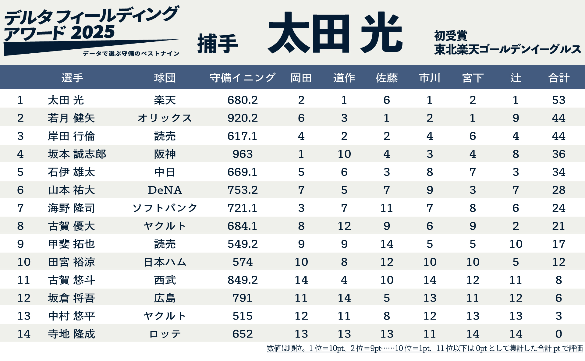 太田光(楽天)が受賞となりました。太田はアナリスト6人のうち3人が1位票を投じ、60点満点中53点を獲得しています。2021年、2023年、2024年と評価対象になってきた太田ですが、順位は6位→7位→10位と芳しいものではありませんでした。それだけに今回の受賞は驚きです。1位票を投じたアナリスト市川博久氏からは、フレーミングは平均程度だが盗塁阻止が優秀だったとのコメントがありました。