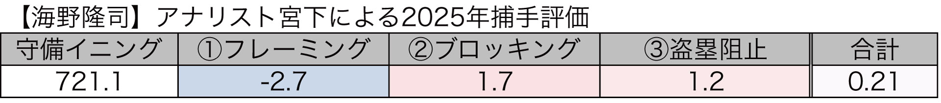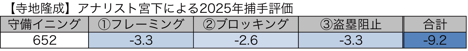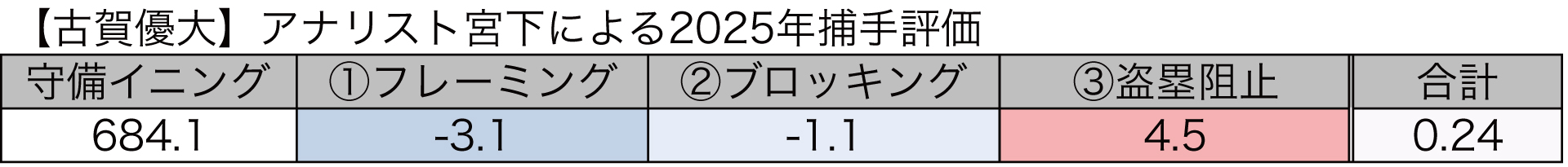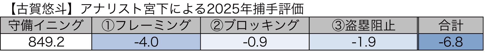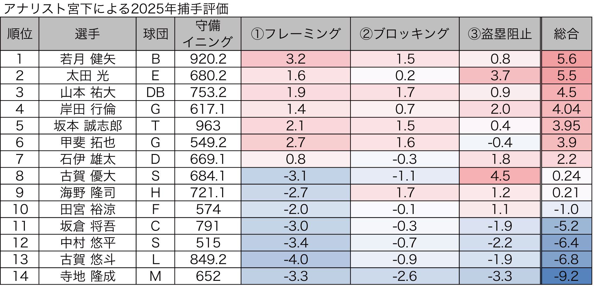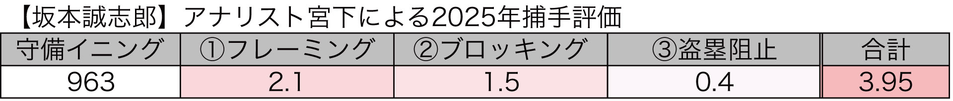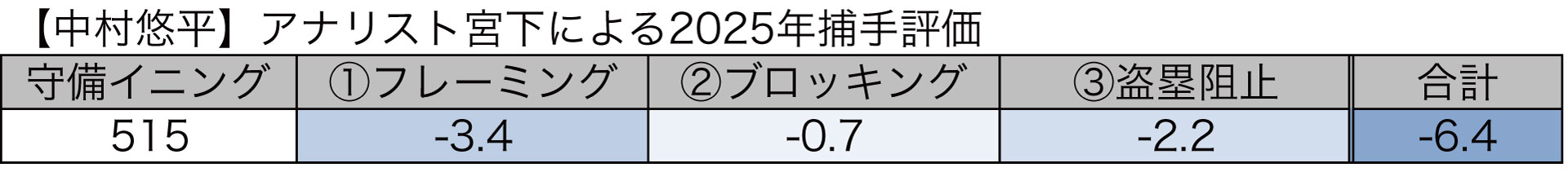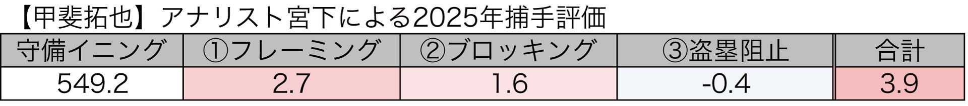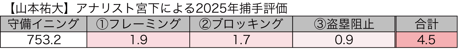 項目別に見ると、フレーミングは-3.1で対象者14人中12位、ブロッキングは-1.1で13位と、大きな課題を抱えています。ただ、盗塁阻止は4.5で対象者中断トツ。弱点を帳消しし、全体としては平均レベルの評価となっています。