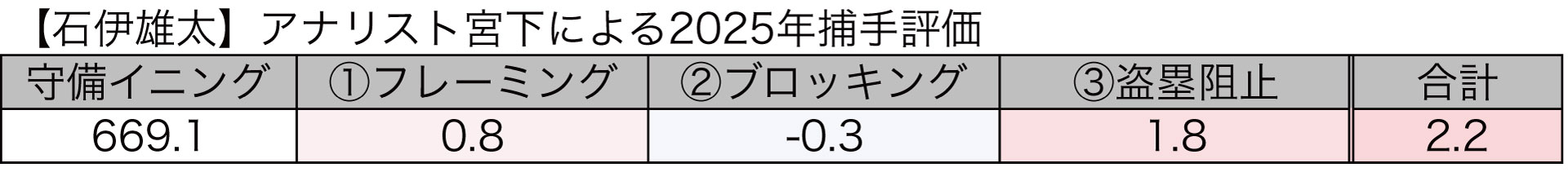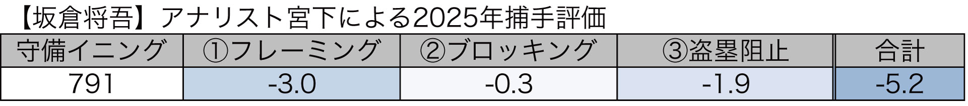 ただ、高度なデータで見ると守備の課題は少しずつ改善しつつあります。以前から大きな課題となっており、昨季は-7.5だったフレーミングは-3.0まで改善しました。まだ強みと言えるレベルにはなっていませんが、着実な成長は見られます。盗塁阻止こそ昨季の1.9から-1.9と悪化しましたが、全体として見ると昨季までのように他の捕手に大きな差をつけられているわけではありません。
