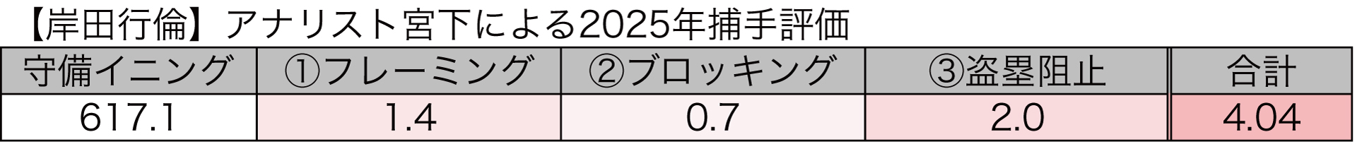 4位にランクインした岸田は平均的な捕手に比べて4.04点失点を減らしたという評価を受けました。
