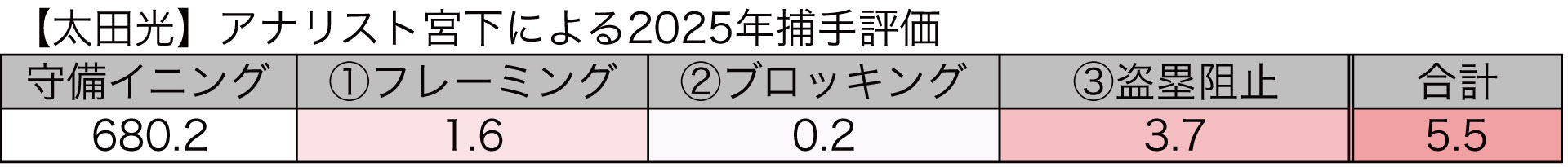 太田は680.2イニングを守り、平均レベルの捕手に比べ5.5点分の失点を防いだという評価を得ています。特に強みだったのは盗塁阻止で、平均に比べて3.7点分も失点を減らしました。今季は盗塁阻止率.383と、一般的なスタッツでも優れた値を記録しましたが、より詳しい分析においてもその評価は変わりません。また、フレーミングでは1.6と、昨季の-2.6から大きく得点を伸ばしました。