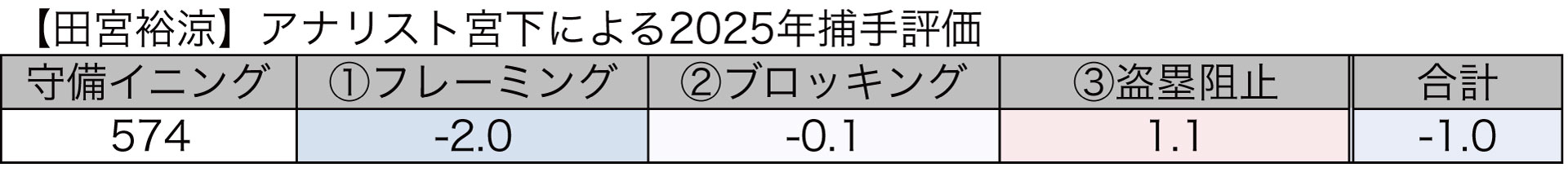 田宮は574イニングを守り、平均的な捕手と比べて1.0点分失点を増やしてしまったという評価になりました。盗塁阻止では平均以上、ブロッキングは平均レベルの成績を残す一方、フレーミングで失点を増やしてしまう傾向は昨季と変わりません。とはいえ強みの打撃を殺さないという点では十分な守備力です。