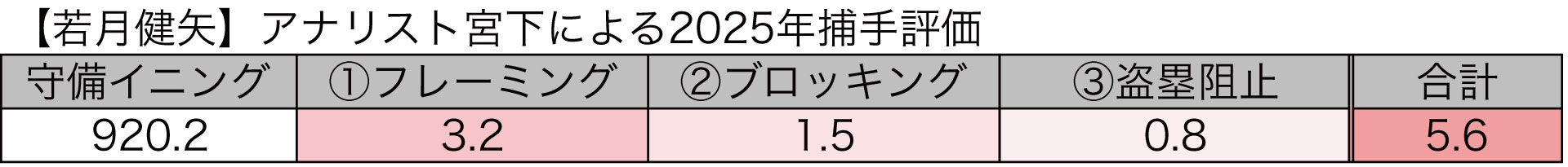 若月は920.2イニングを守り、平均レベルの捕手に比べて5.6点分も失点を減らしたという評価です。