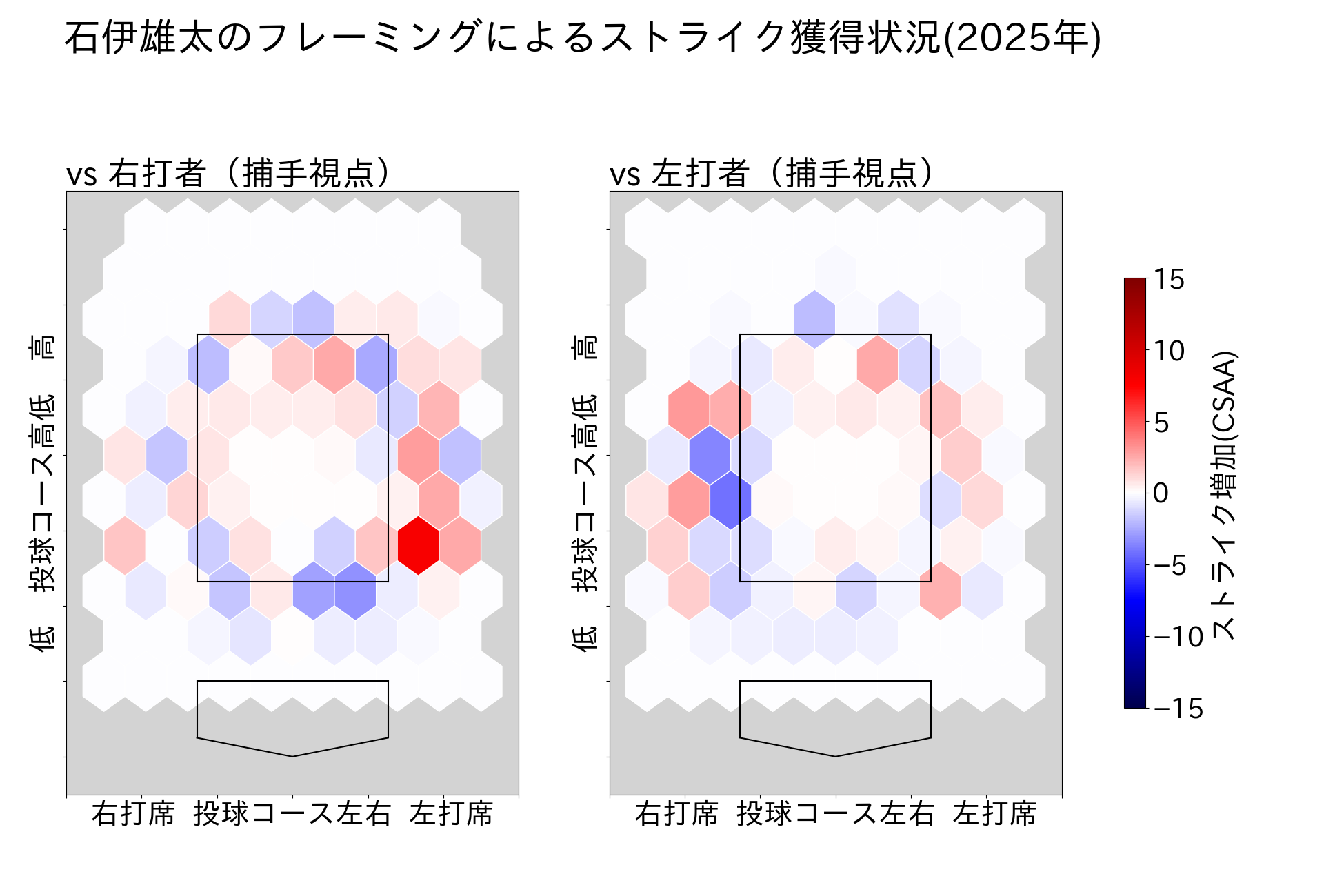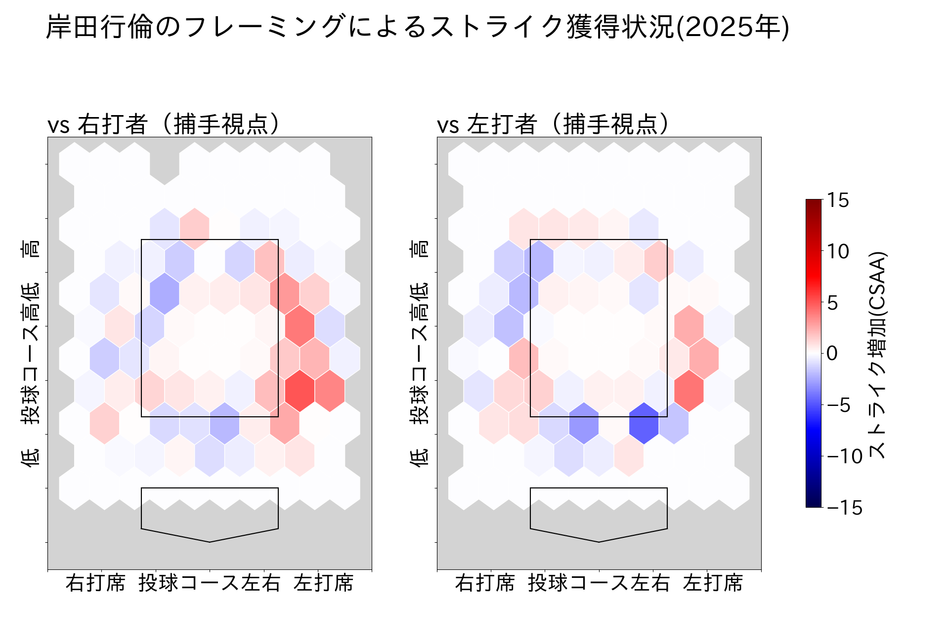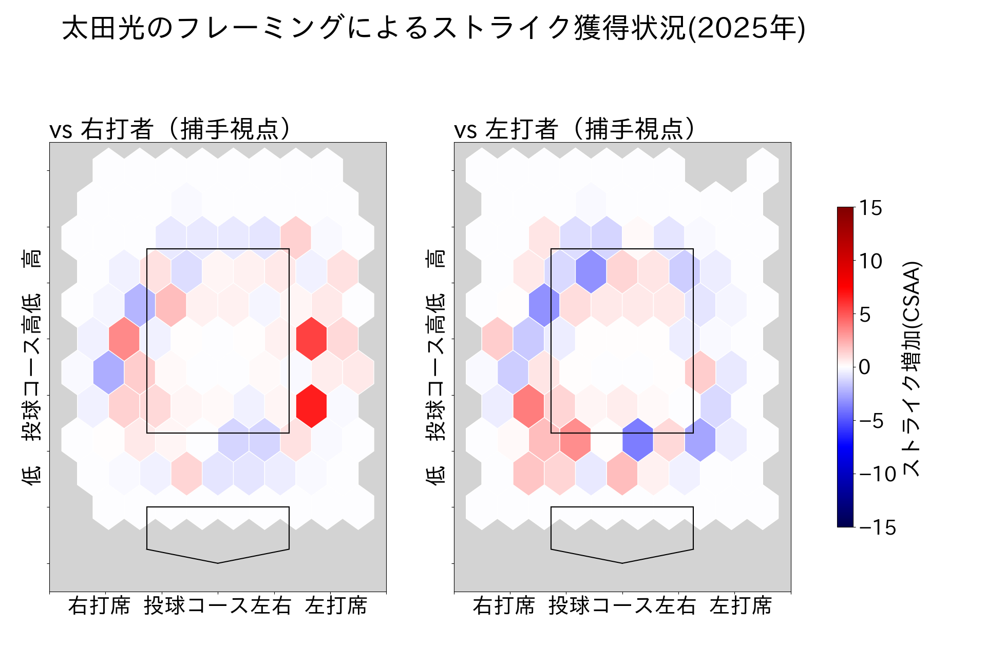 フレーミングでは、右打者の外角低めに明確な強みを持っていた反面、左打者の高めはやや苦手にしていたようです。
