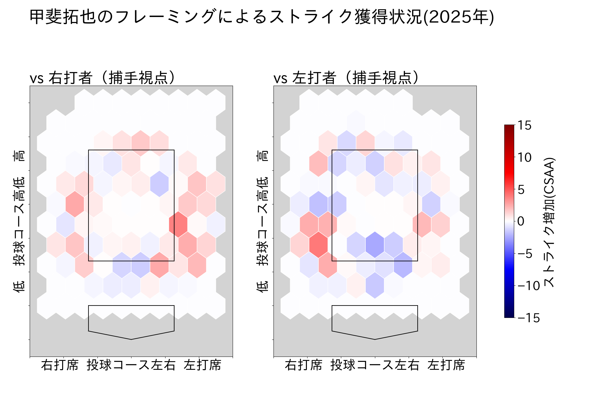 以前専門家に指導を受け、低めのコースの苦手を克服したと見られていた甲斐ですが、今季は左打者の低めがかなりマイナスになっています。依然としてフレーミングは強みであり続けていますが、移籍にともなってプレースタイルに何らかの変化が見られた可能性はあります。
