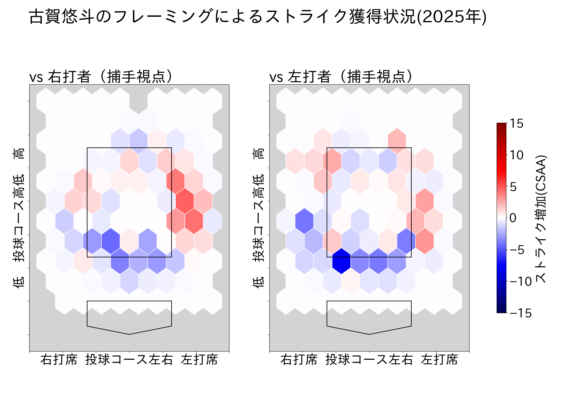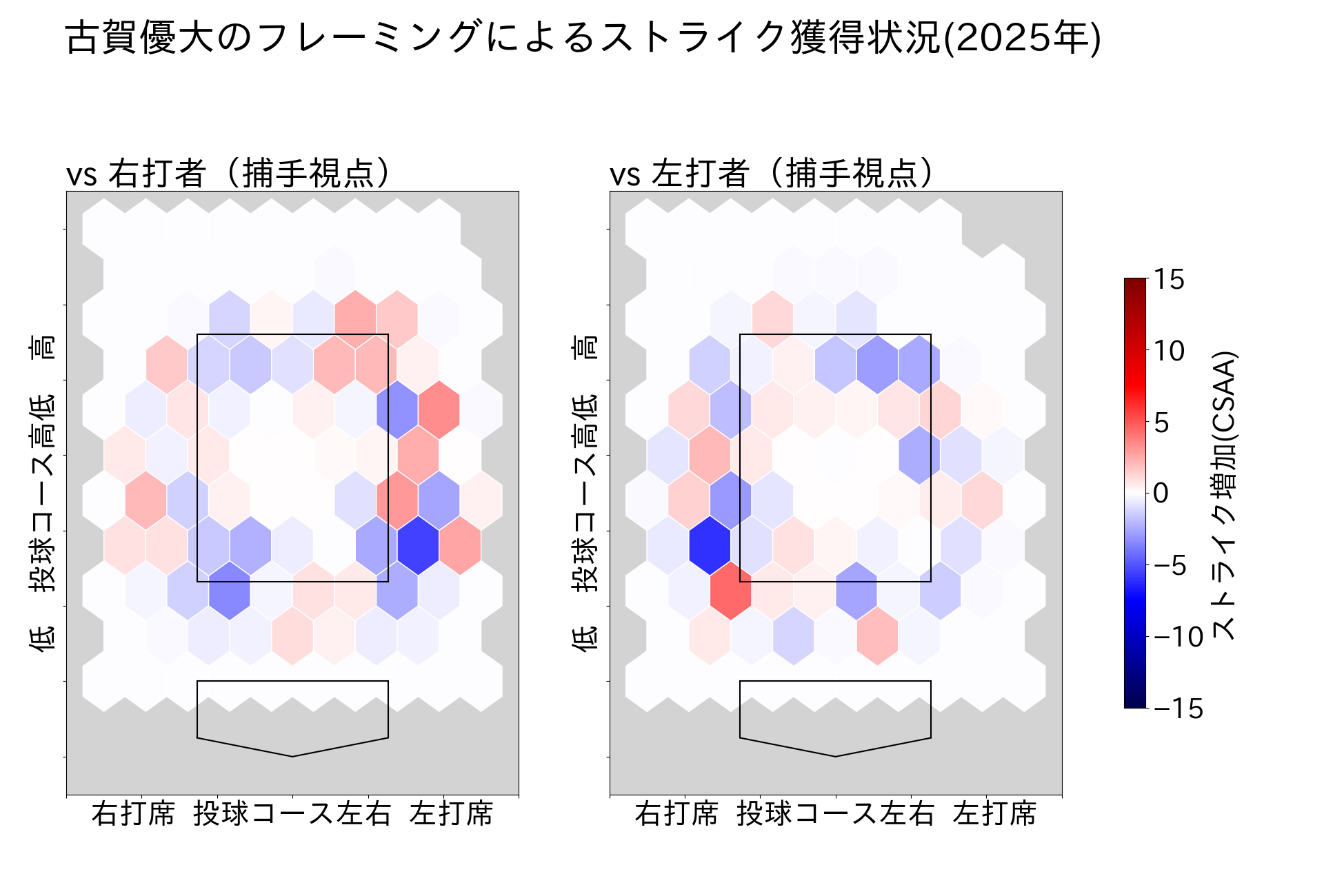 フレーミングを見ると、今季の古賀悠は低めでストライクを大幅に減らしてしまったようです。ただ、逆に言えばこれ以外のコースはそれほど大きな穴になっていません。低めさえ改善できればという状況にはなっています。
