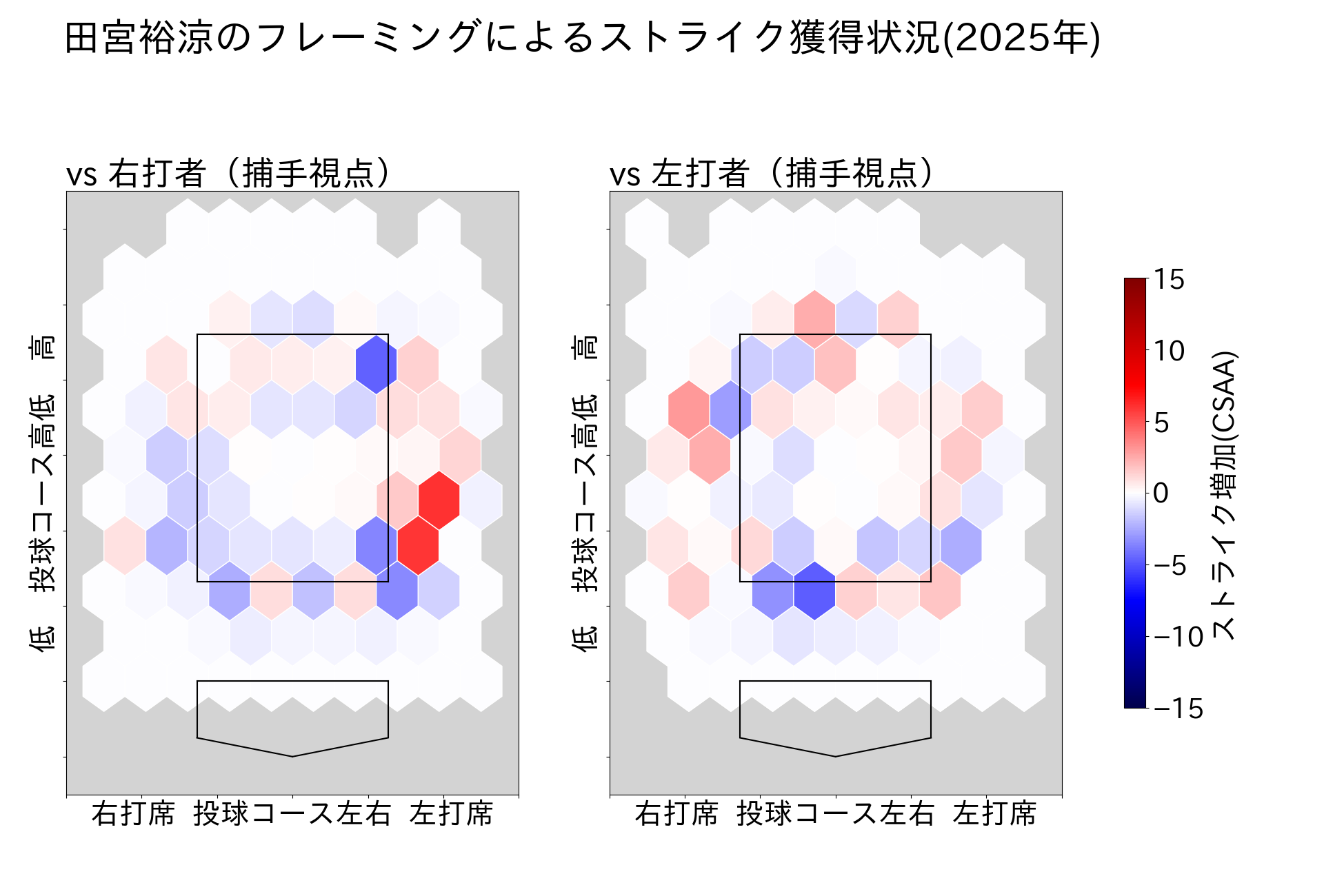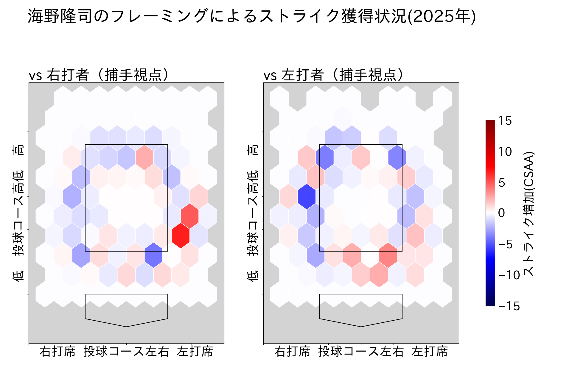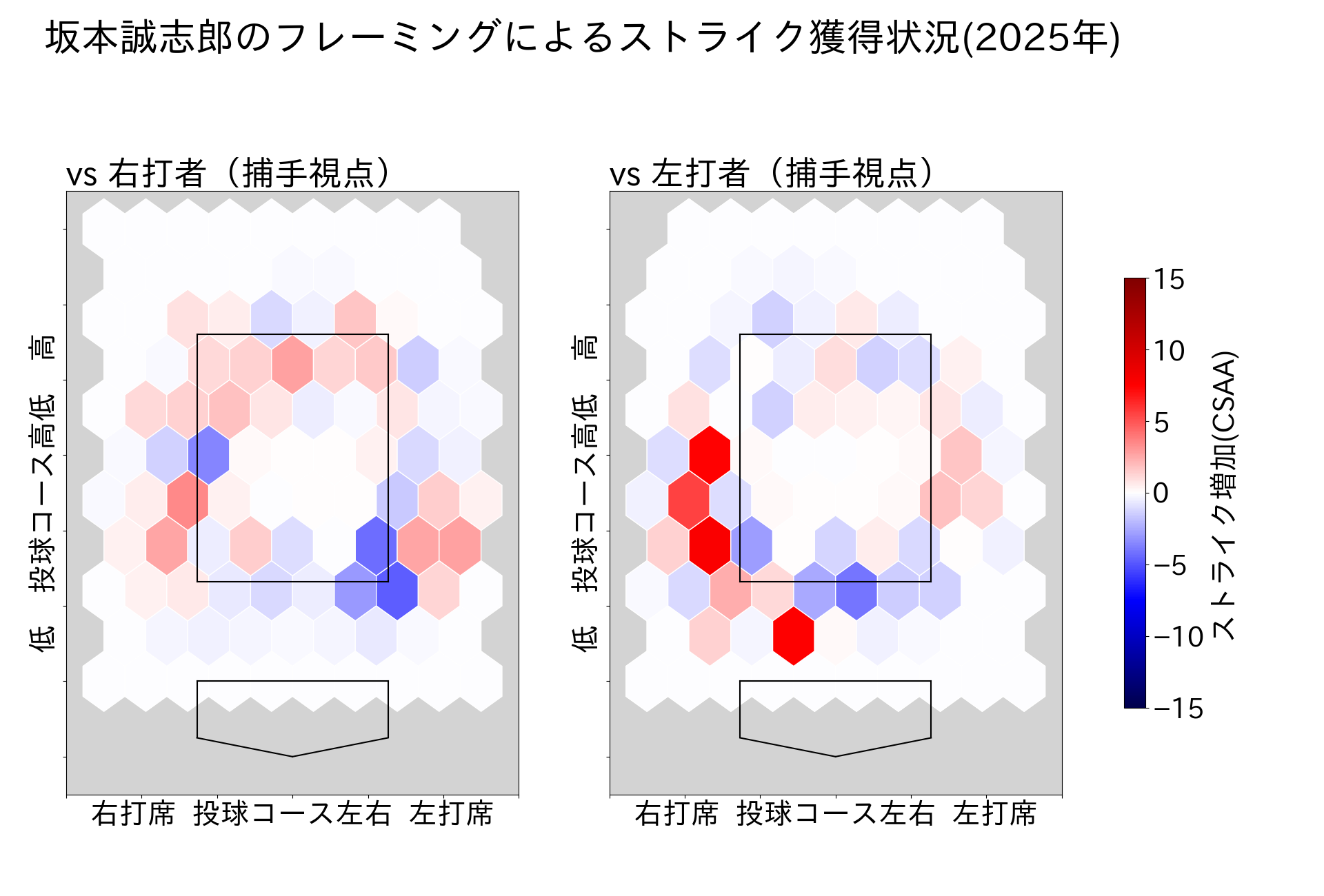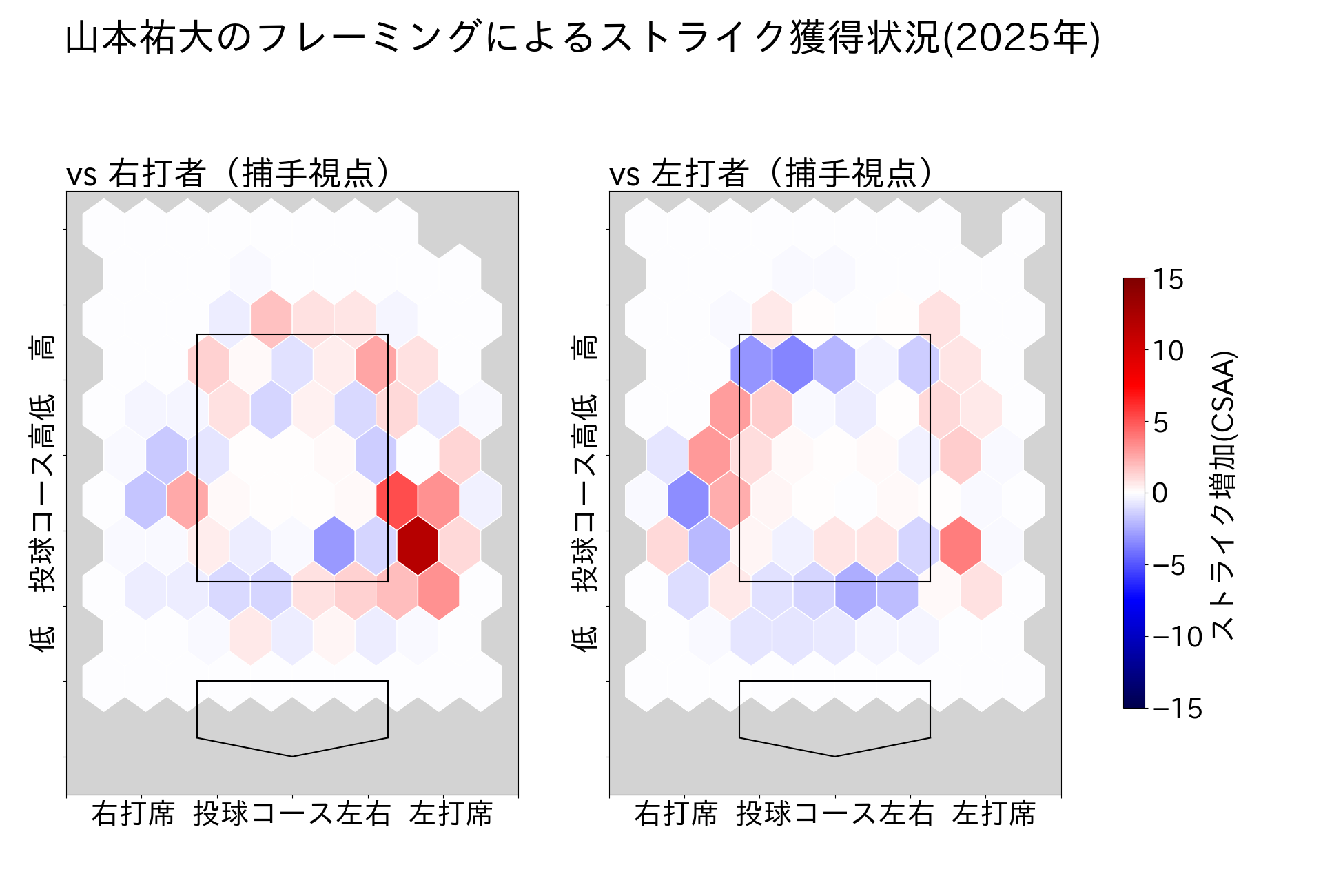 左右どちらの打者に対しても外角への投球でかなりストライクを増やしており、昨季とはやや異なる傾向が見られます。昨季から今季にかけてフレーミングに関して何らかの取り組みを行ったのかもしれません。