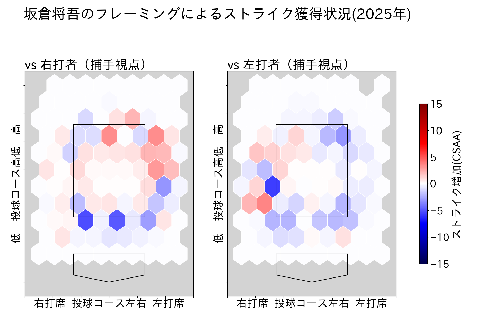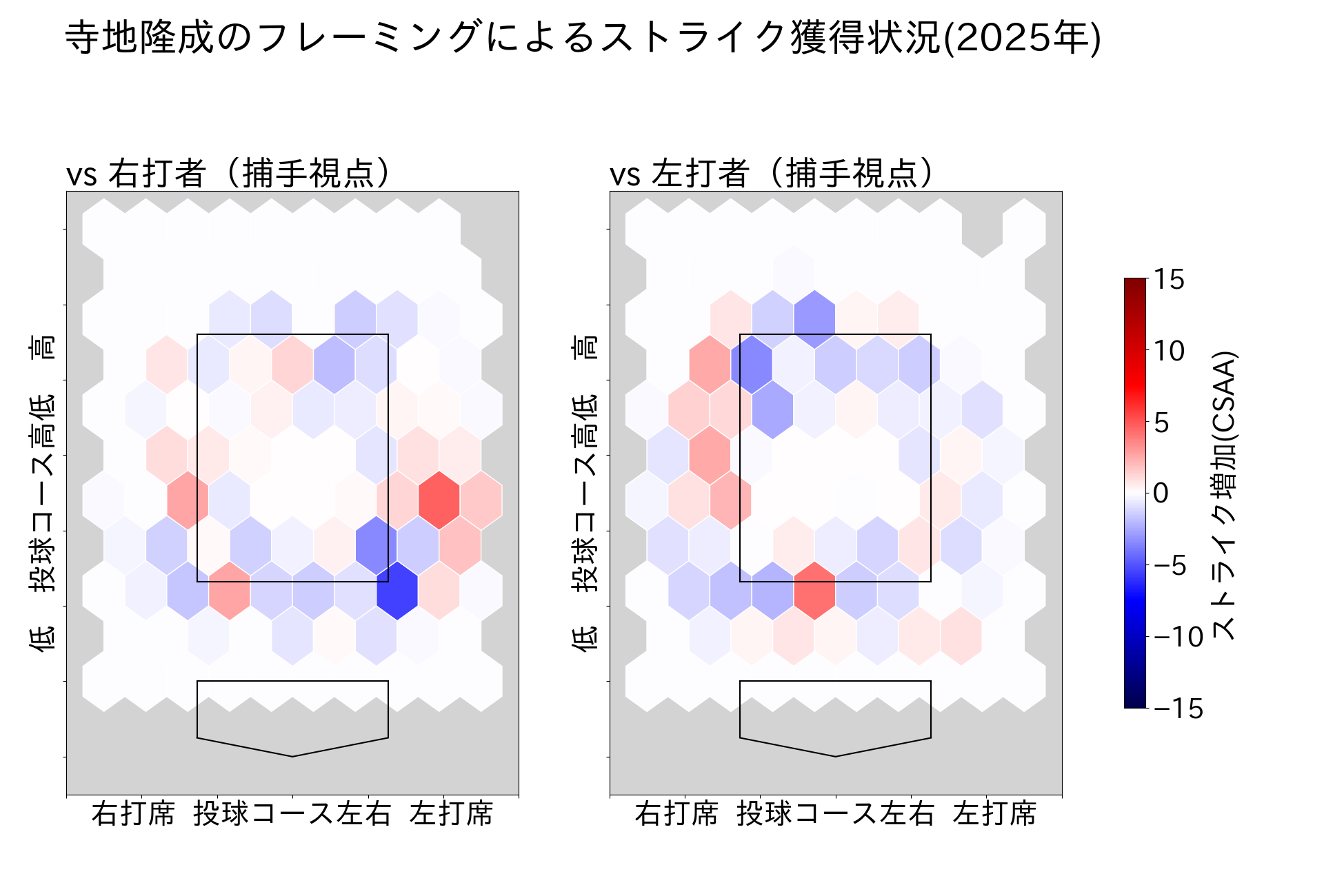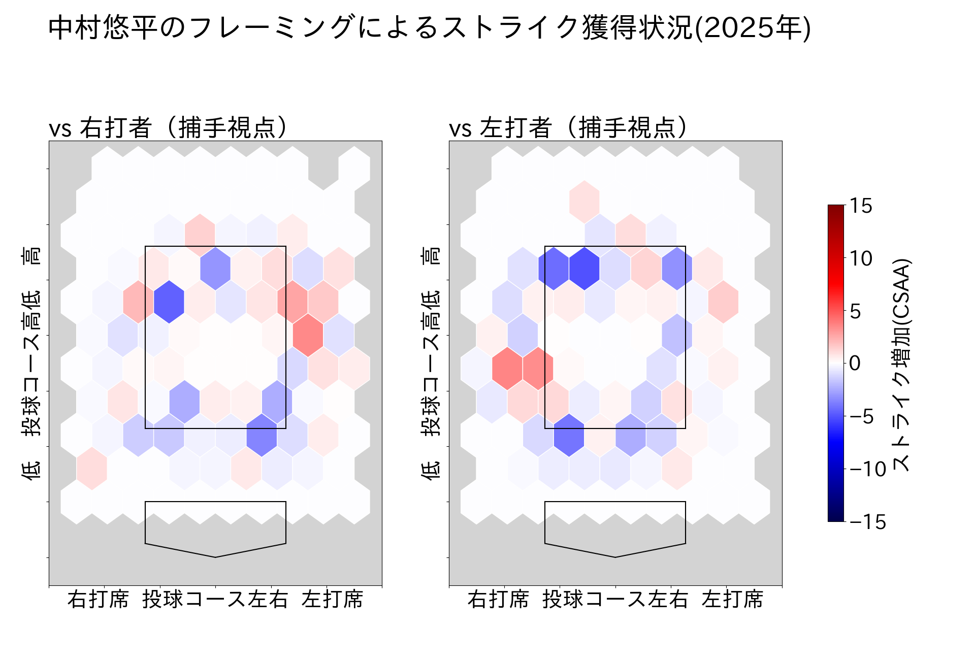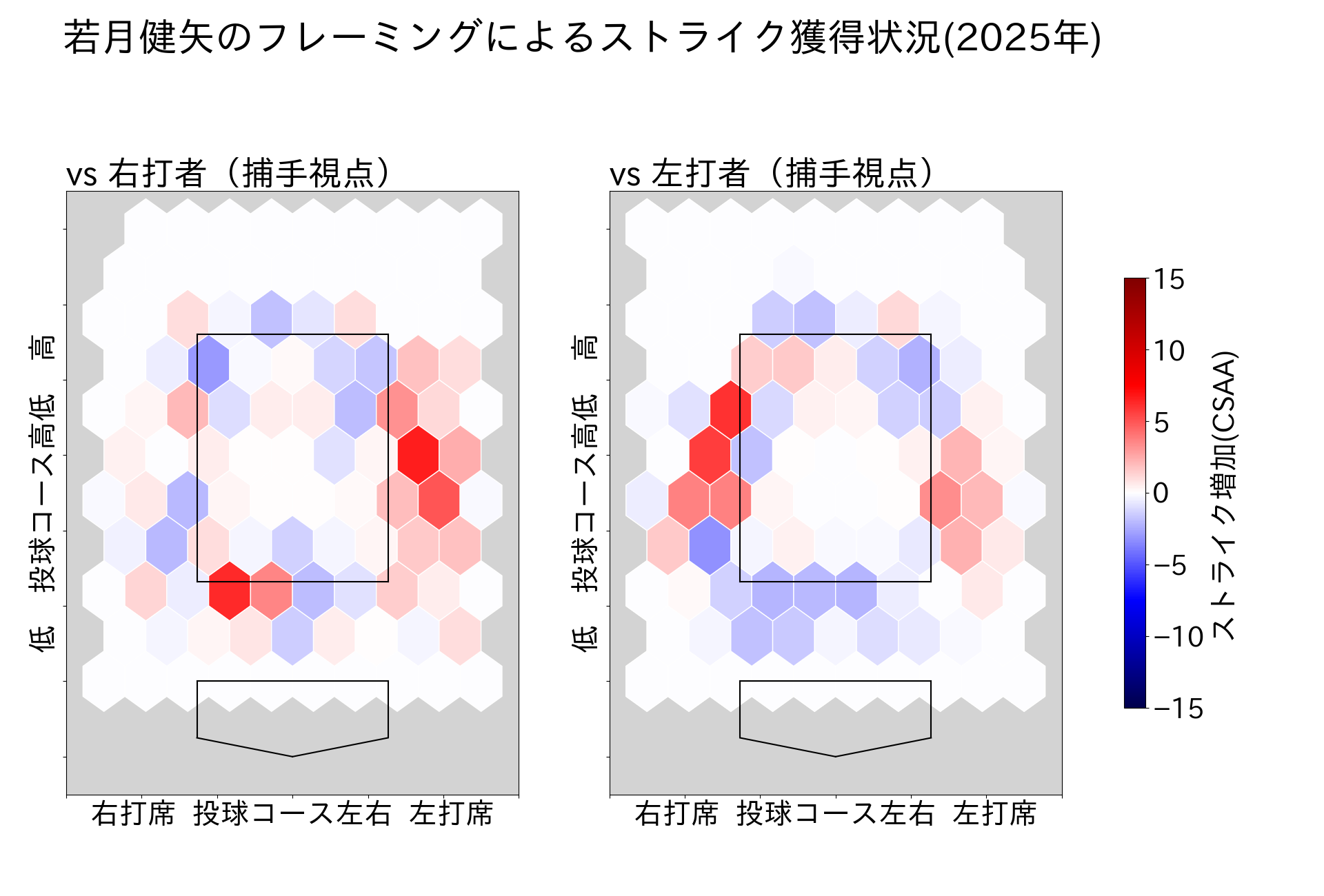 左右どちらの打者に対しても外角への投球でかなりストライクを増やしており、昨季とはやや異なる傾向が見られます。昨季から今季にかけてフレーミングに関して何らかの取り組みを行ったのかもしれません。