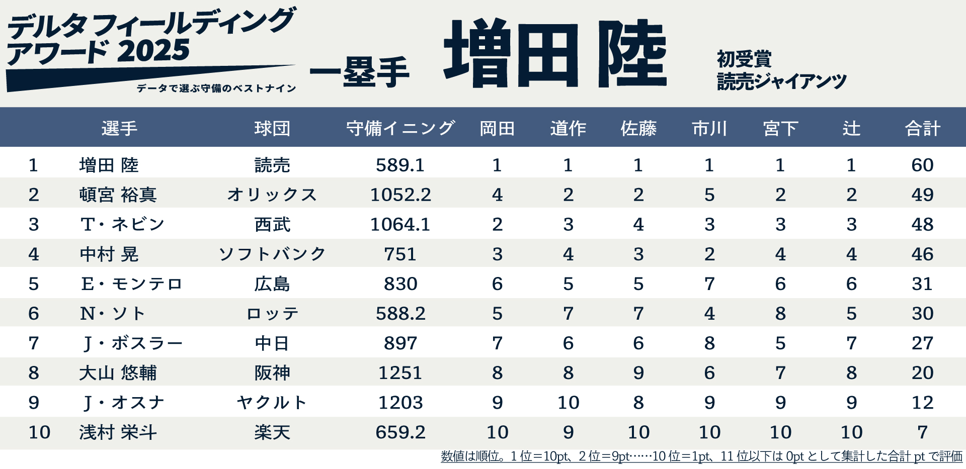 一塁手部門は増田陸(読売)が受賞を果たしました。アナリスト6人全員が1位票を投じ、満場一致での選出です。増田は今季こそ岡本和真の離脱により一塁での出場機会が増えましたが、本来は二遊間をこなすだけの守備力を持つ選手。アナリスト辻捷右氏からは「すべての項目で優れた値を記録し、文句なし」だったとのコメントがありました。