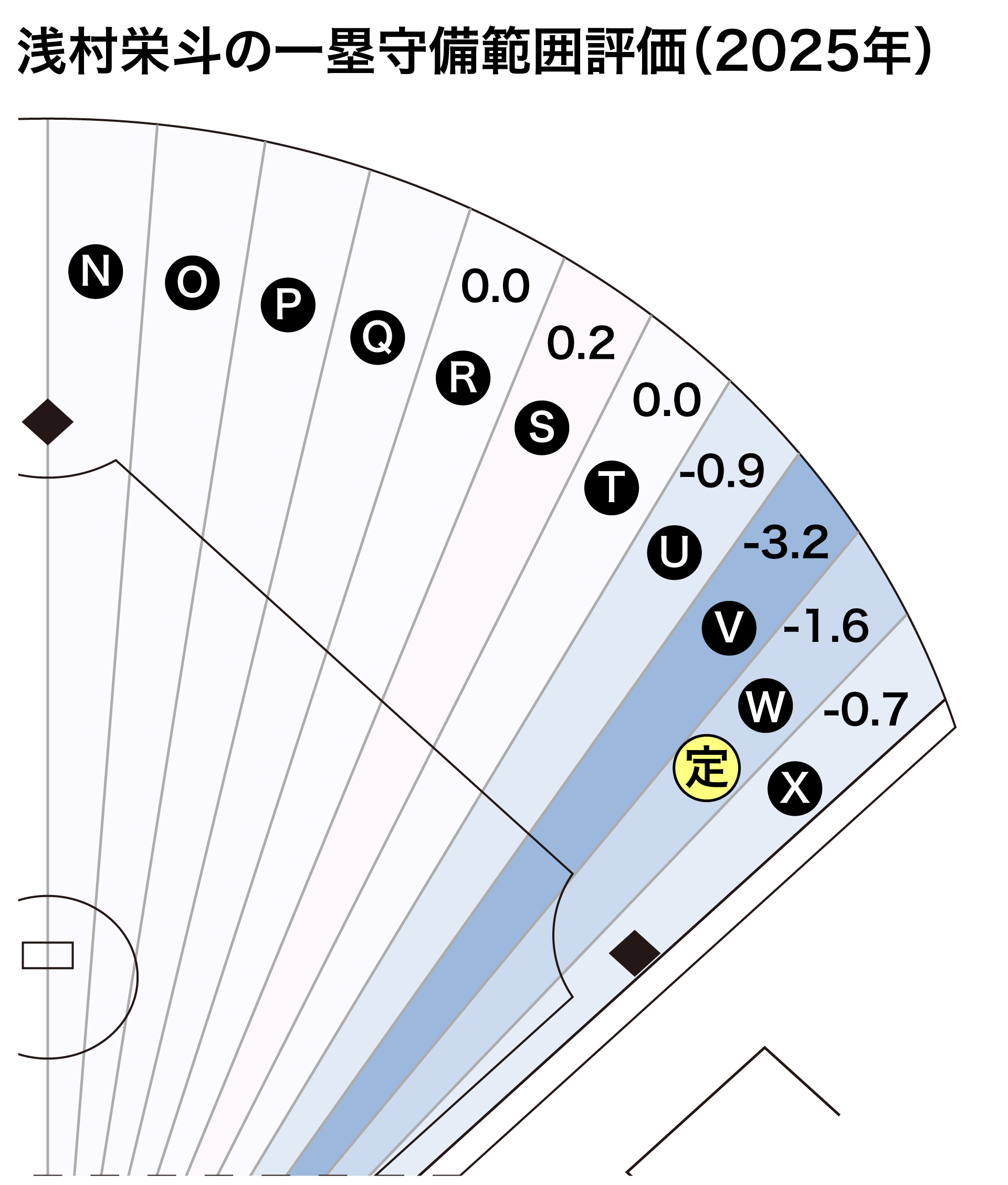 浅村の守備範囲評価は-6.3。評価対象の10人の中ではワーストになってしまいました。ほぼすべてのゾーンで他の一塁手に差をつけられてしまっています。現在35歳という年齢を考えると今後大幅な改善は望みにくく、来季以降は指名打者での起用をメインに考えたほうがよいのかもしれません。
