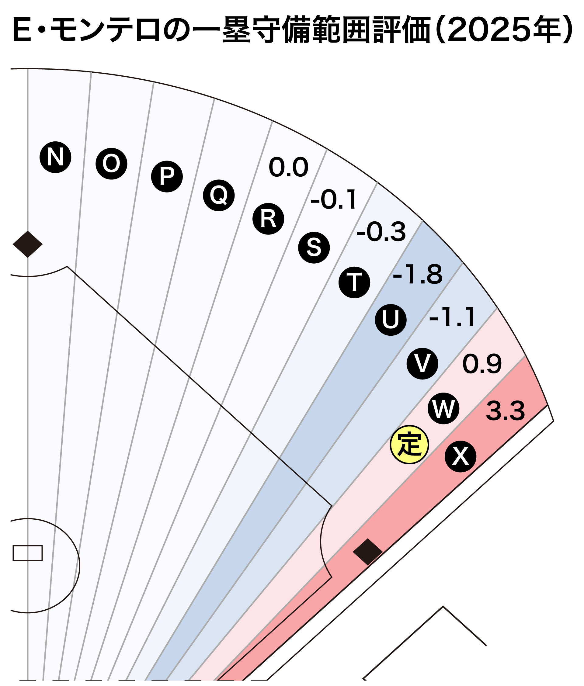 モンテロの守備範囲評価は0.9と、わずかに平均を上回りました。守備範囲自体は狭いものの、ゾーンXで3.3点分の失点を防いでおり一塁線の打球に強さを見せています。ソトや中村同様、一塁線寄りにポジショニングしているのかもしれません。