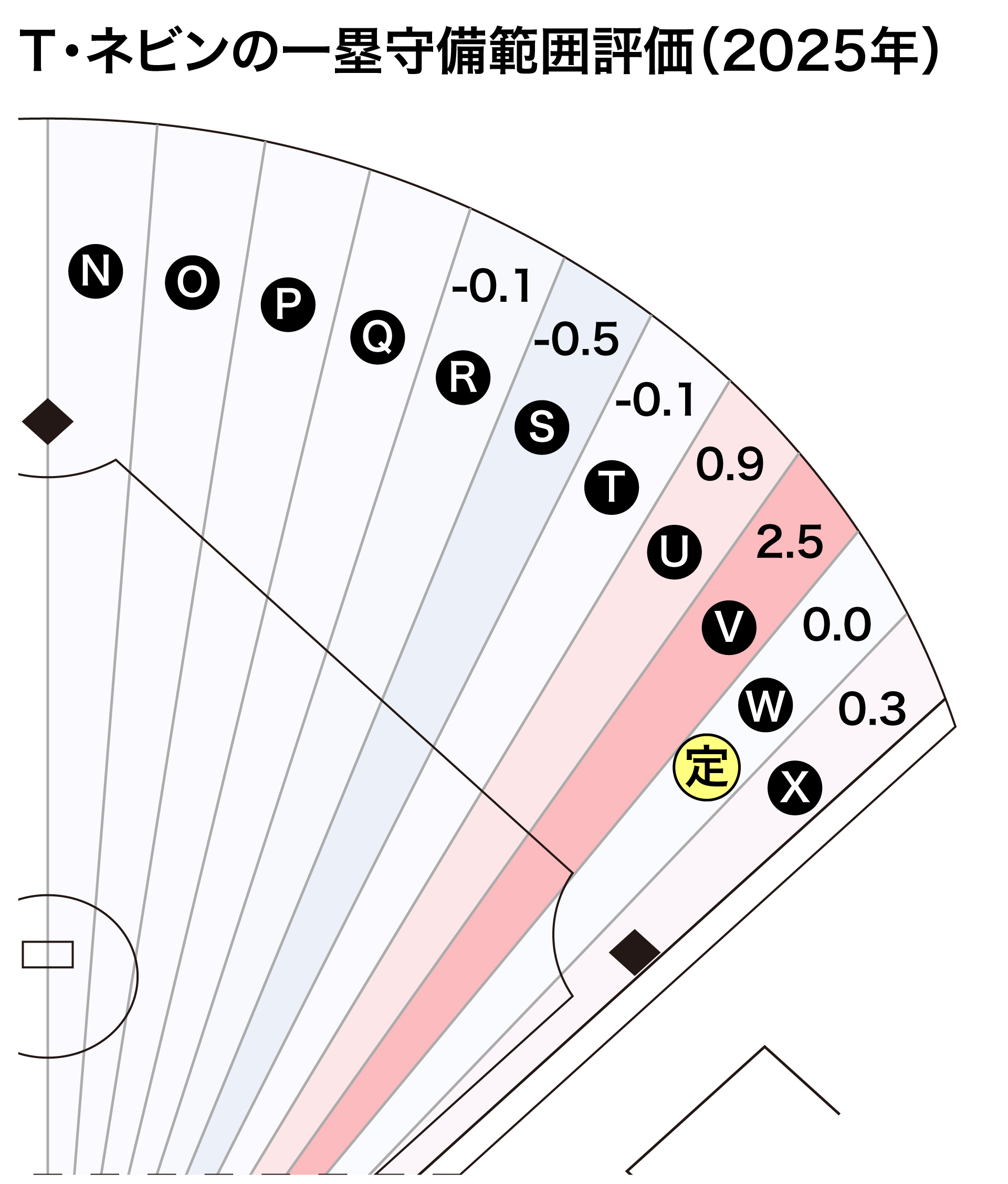 ネビンの守備範囲評価は2.7。特に一二塁間の打球に対してかなり強みを発揮する一方、苦手なゾーンは見当たりません。今季は打撃面で素晴らしい活躍を見せ、チームの浮上に一役買ったネビン。打撃ほどのインパクトはありませんが、守備面での貢献も見逃せません。