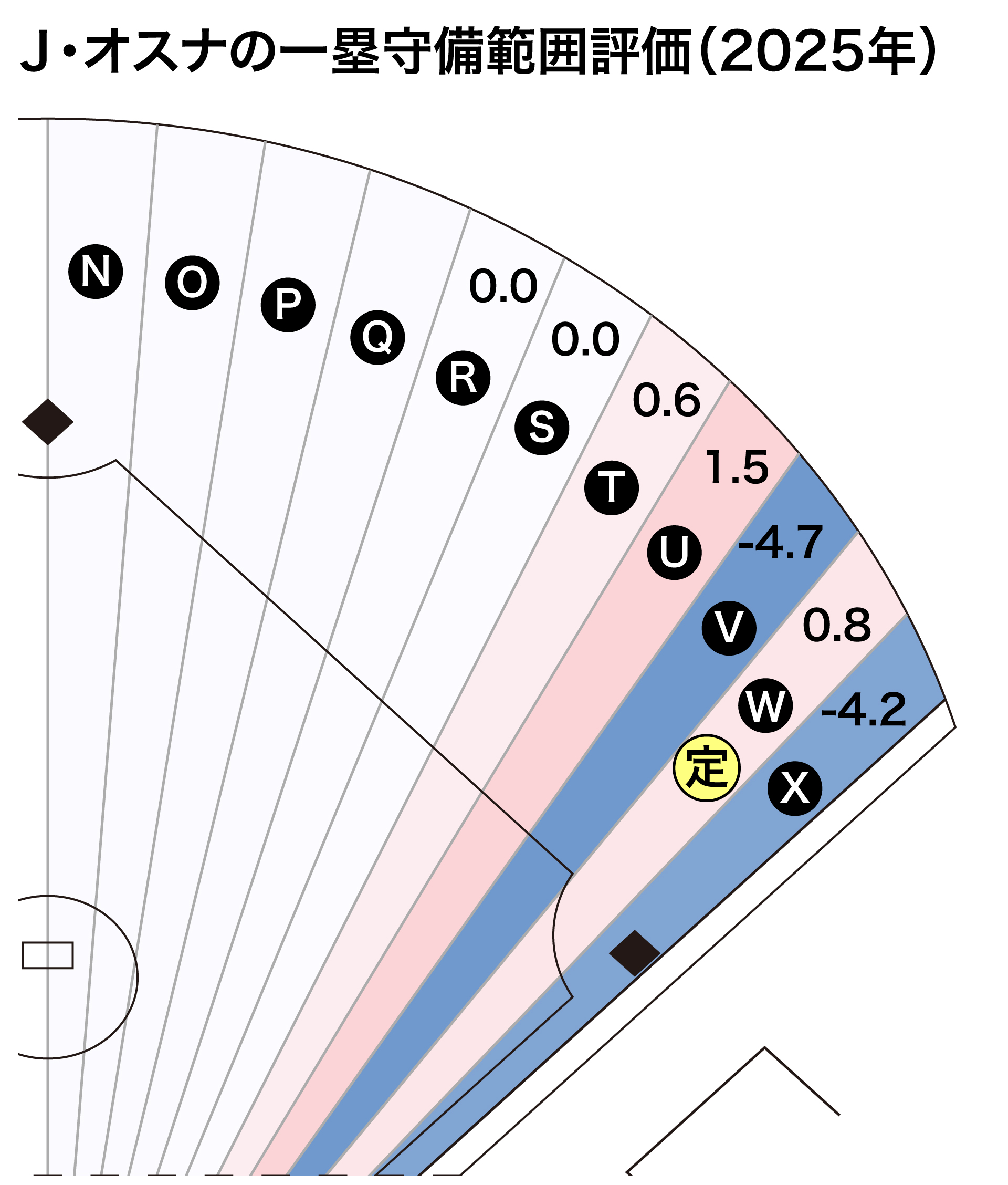 オスナの守備範囲は-6.1。守備範囲の狭さで失点を増やしてしまう傾向は例年と変わりありません。ただ、ゾーン別の傾向は少し異なります。