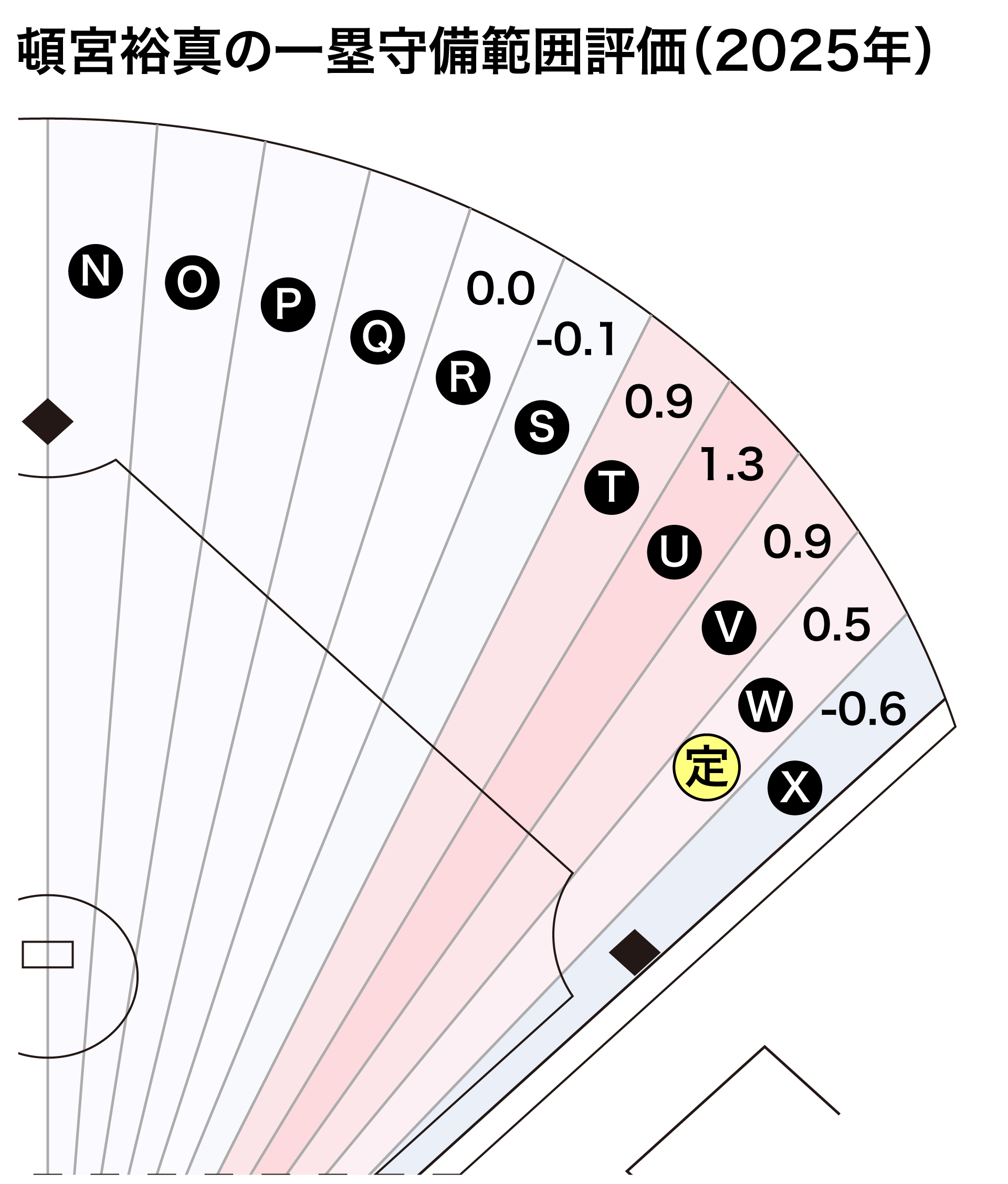 頓宮の守備範囲評価は2.7。頓宮は以前フィールディングアワードの対象選手となった2023年にも優れた守備範囲を誇っていました。ゾーン別に見ると、一二塁間の打球で平均よりもアウトを増やしている一方、一塁線にあたるゾーンXは-0.6。一塁線の打球をやや苦手としていたようです。