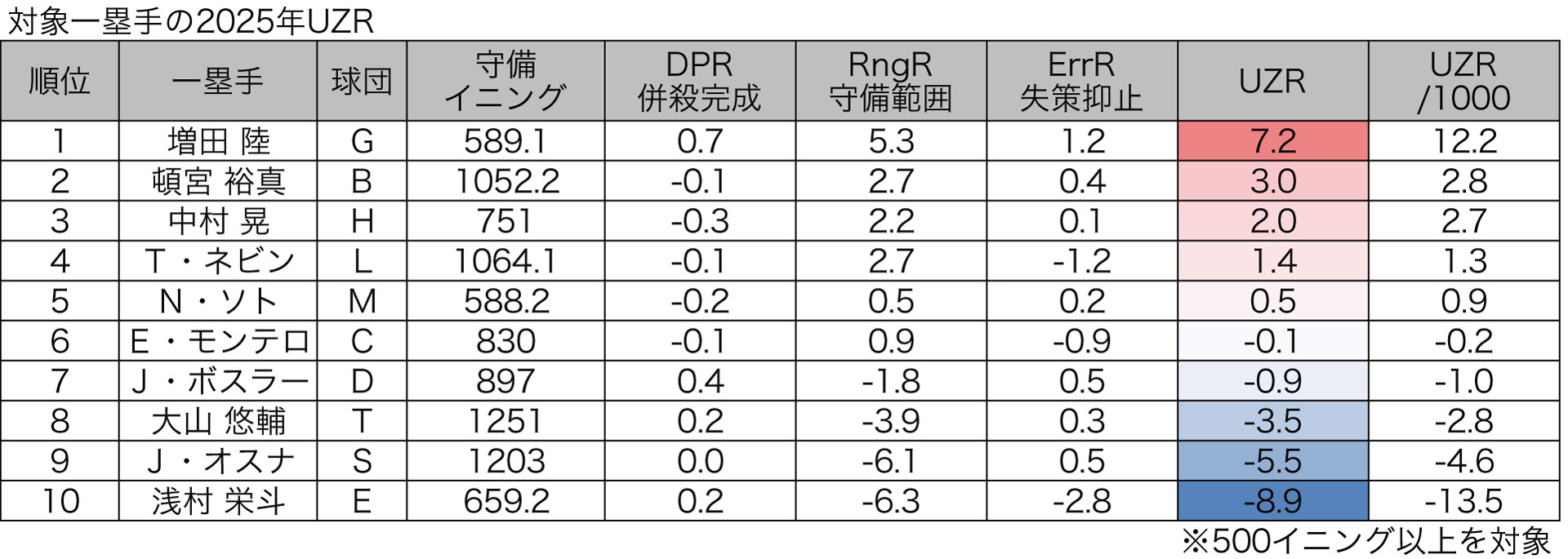 - 辻:基本的にはUZR(守備範囲・失策・併殺完成)で評価。守備範囲については打者の左右で分割することでポジショニングによるズレを是正