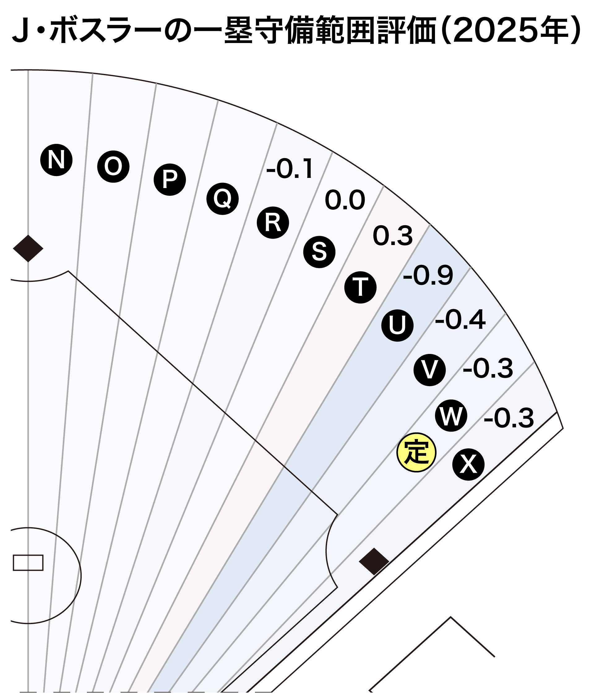 ボスラーの守備範囲評価は-1.8で、やや平均を下回りました。全体として見ると大きな強みも弱みもないようです。今季打撃面でまずまずの活躍を見せ、一塁のレギュラーに定着したボスラー。守備の面でも一塁を無難にこなしていたようです。