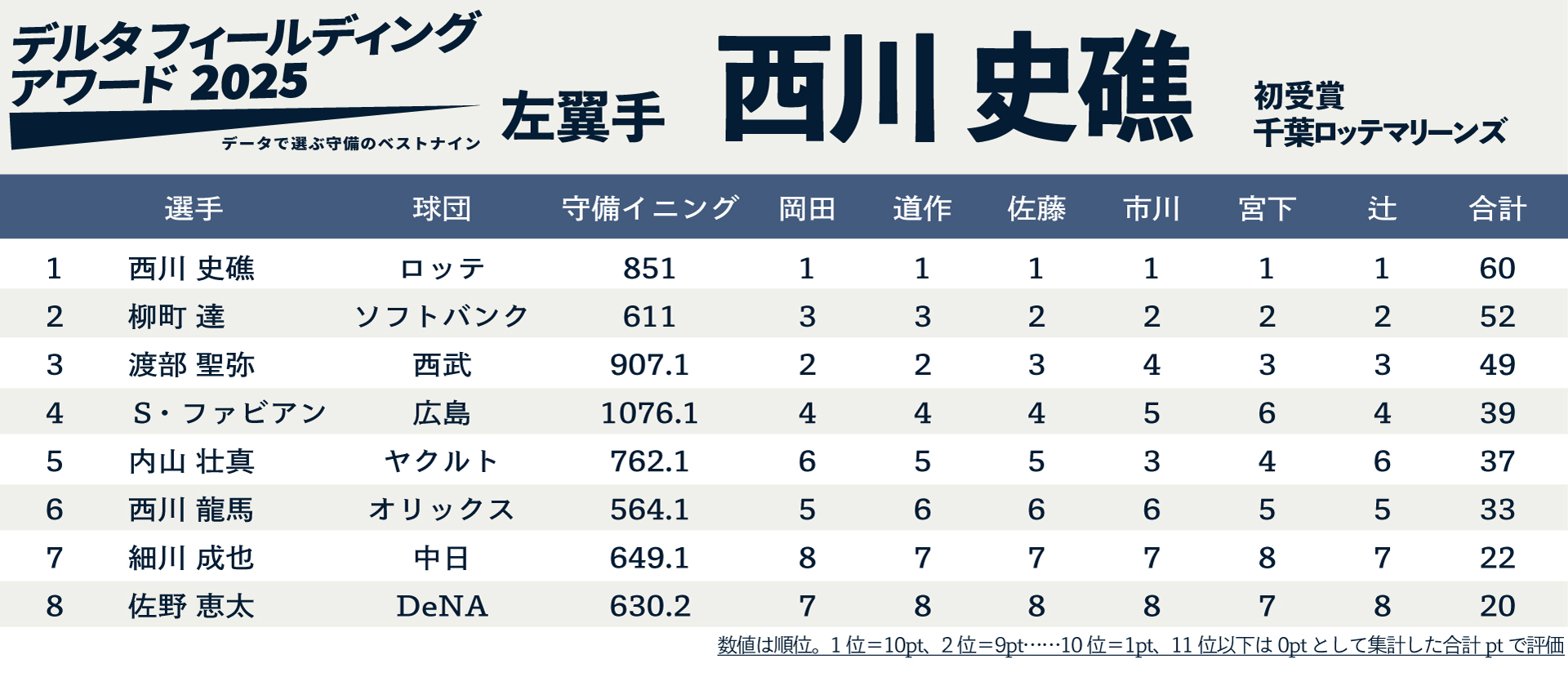 左翼手部門は新人王を獲得した西川史礁(ロッテ)が、アナリスト6名全員から1位票を獲得しトップとなりました。打撃型の選手と見られがちですが、若さを生かした守備力で高い貢献度をみせたようです。アナリスト市川博久氏からは前方の打球、辻捷右氏からは滞空時間の短い打球について守備範囲の広さを指摘する声がありました。