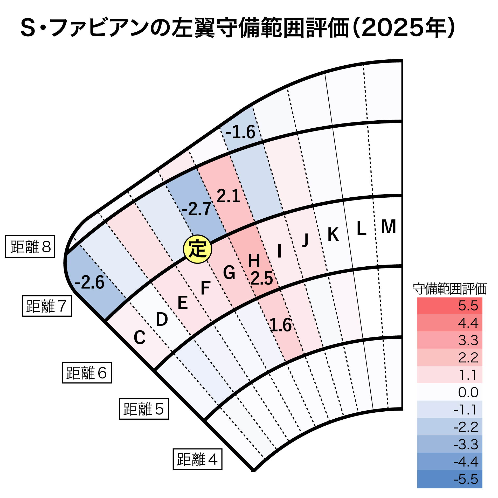 サンドロ・ファビアン(広島)は1076.1イニングを守り守備範囲評価は2.1。マップを見ると、どちらかというと前方の打球で多く失点を防いでいる様子がわかります。特に左中間寄りの打球については他の左翼手に大きな差をつけました。一方で後方の飛球処理はややマイナスが大きいゾーンが見られます。