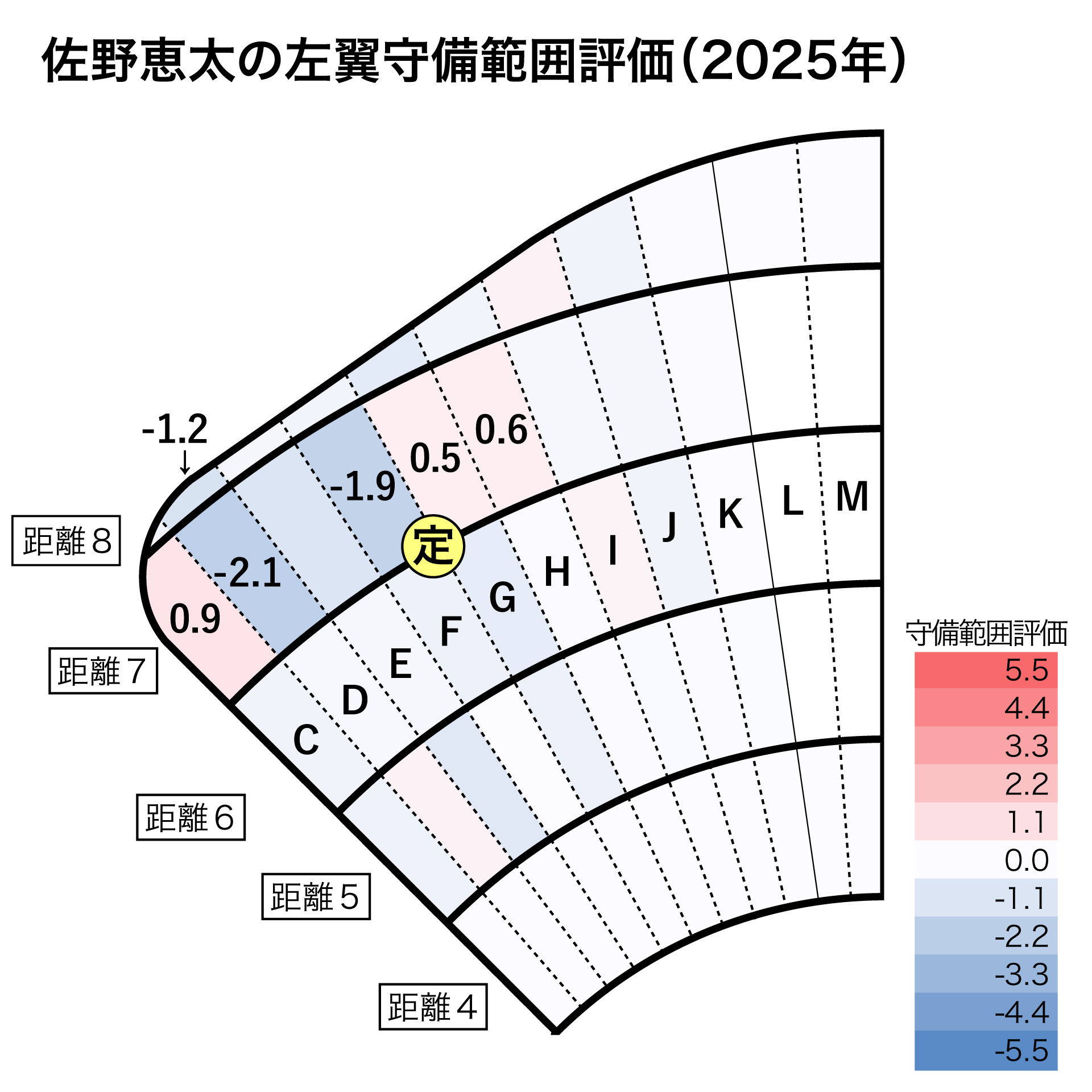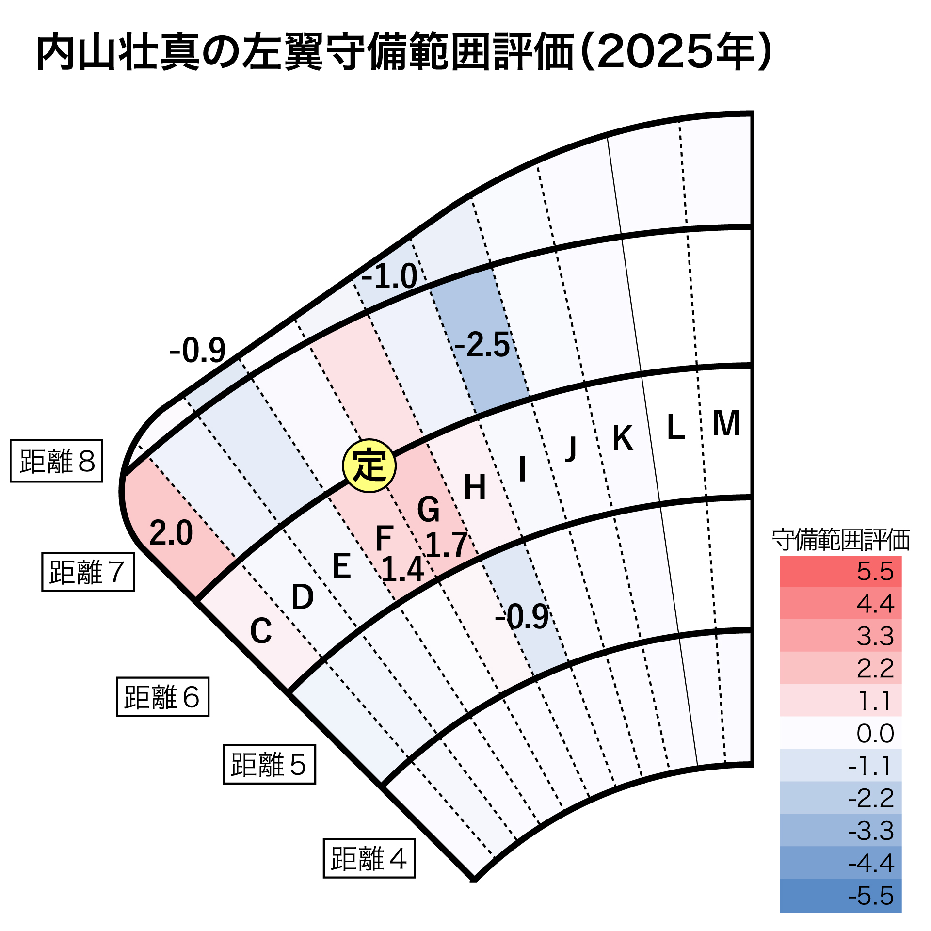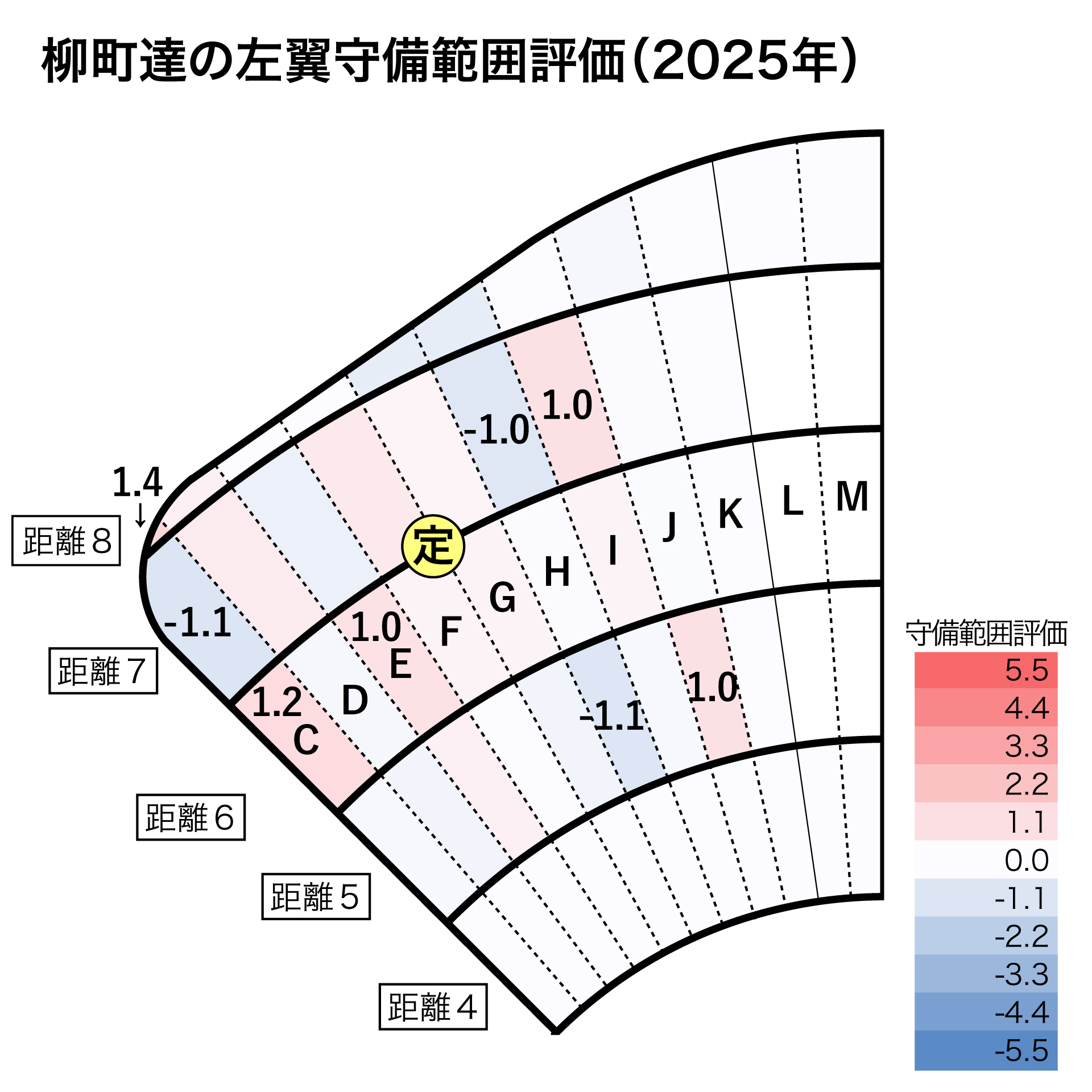 各選手が具体的にどのような打球を得意・不得意としているのか処理状況を確認していきましょう。以降の図の値は、平均的な左翼手と比較してそのゾーンの打球処理でどれだけ失点を防いだかを示します。黄色い円に「定」と書かれた印は、おおよその定位置を表しています。
