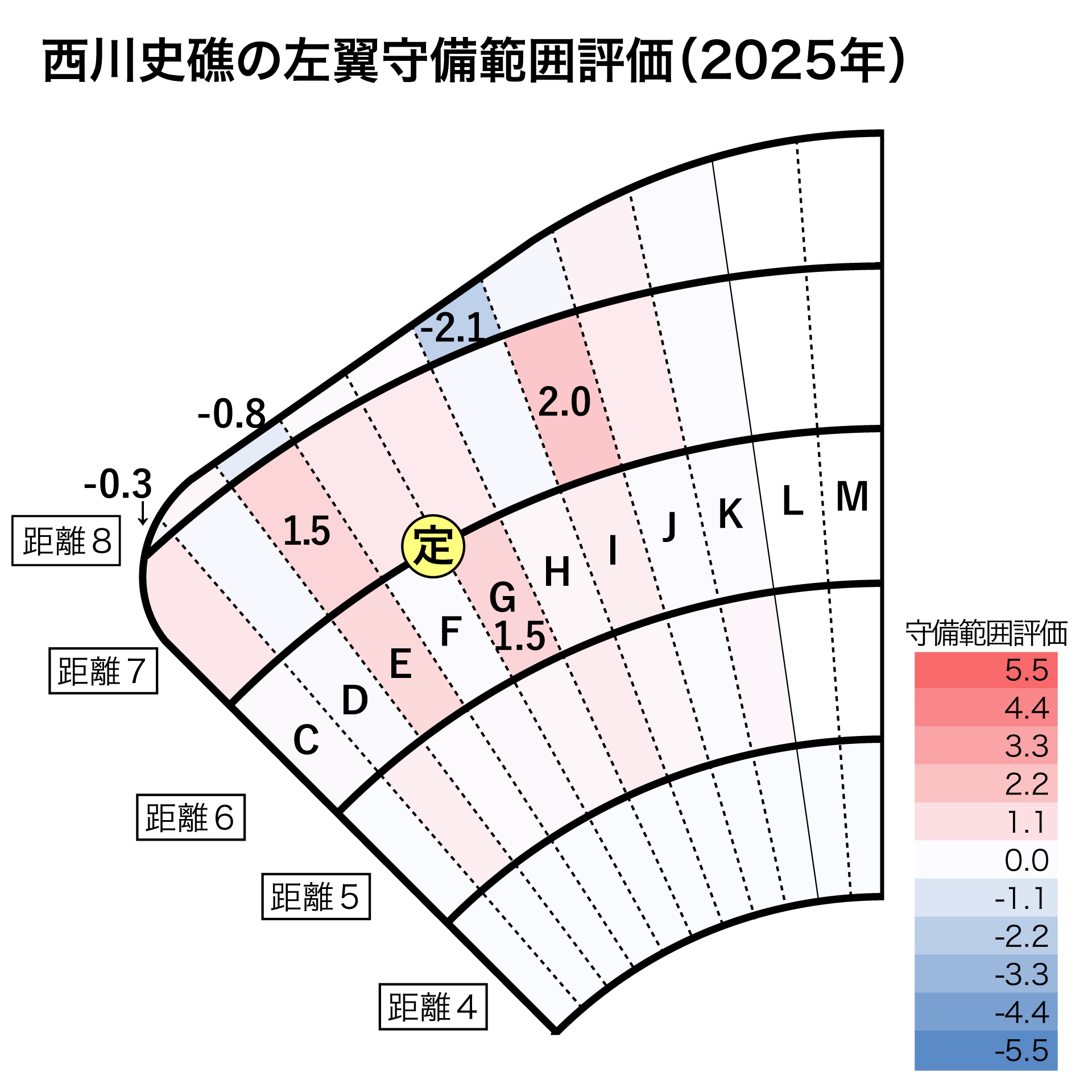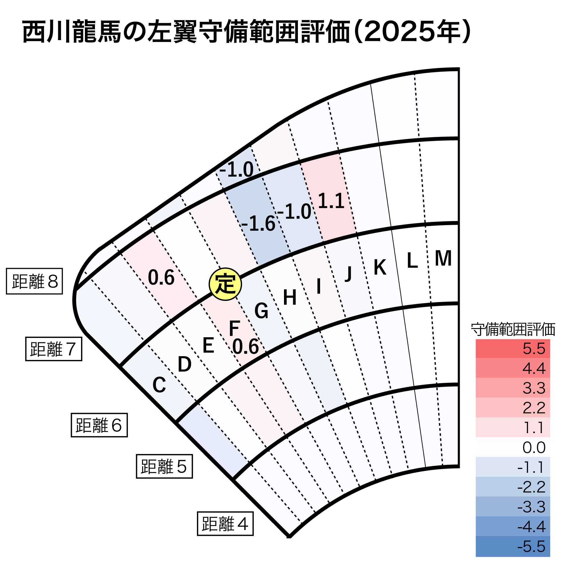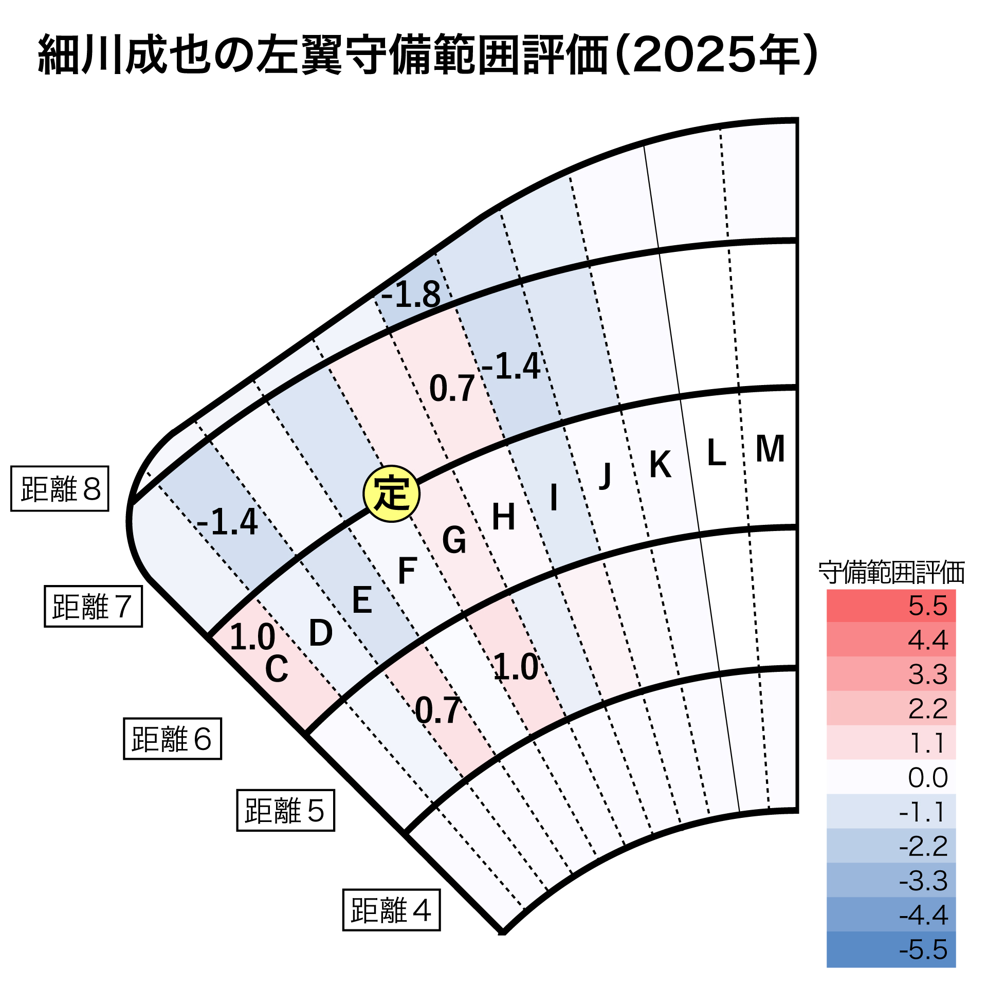 各選手が具体的にどのような打球を得意・不得意としているのか処理状況を確認していきましょう。以降の図の値は、平均的な左翼手と比較してそのゾーンの打球処理でどれだけ失点を防いだかを示します。黄色い円に「定」と書かれた印は、おおよその定位置を表しています。
