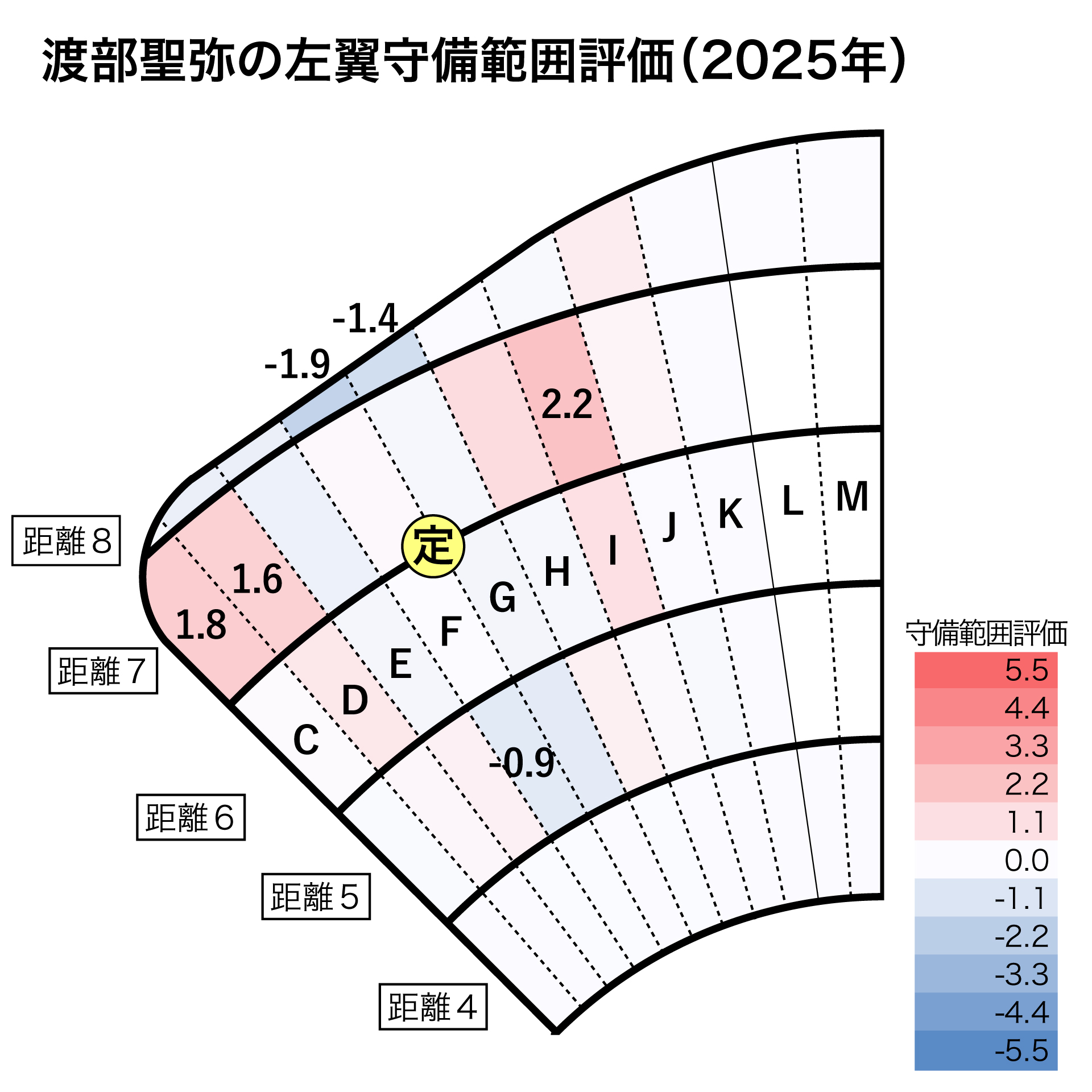 渡部は907.1イニングを守り守備範囲評価が2.8。具体的にどのような打球に強かったかを見ると、定位置周辺よりも定位置から離れた打球で多く失点を防いでいる様子がわかります。特に定位置から左右に大きく動いた打球での失点抑止が大きかったようです。渡部は特別俊足が評価される選手ではありませんが、このあたりは若さゆえの運動能力が活きたところでしょうか。