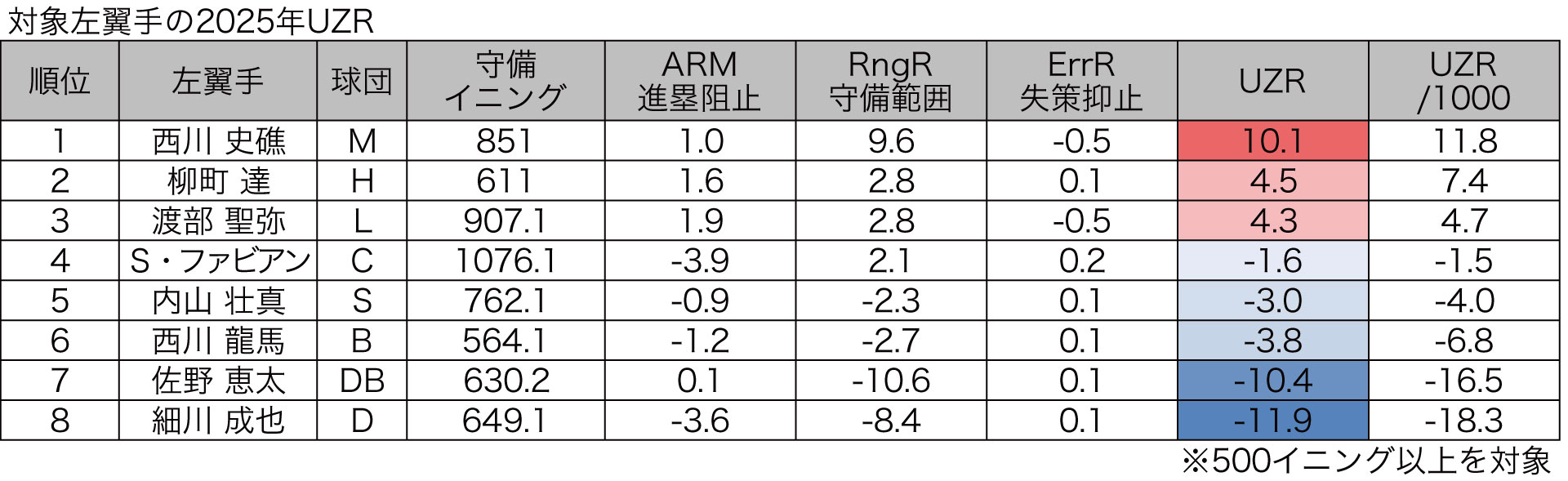 左翼は例年、指名打者があるパ・リーグの選手が上位に、セ・リーグの選手が下位に集中する傾向があります。セ・リーグにはDH制がなく、打力は高いが守備力が低い選手をDHに逃がすことができないためです。今季も上位は西川史、柳町、渡部聖弥(西武)とパ・リーグ勢がずらり。下位には細川成也(中日)佐野恵太(DeNA)とセ・リーグ勢。今季もこの傾向に変わりはありませんでした。