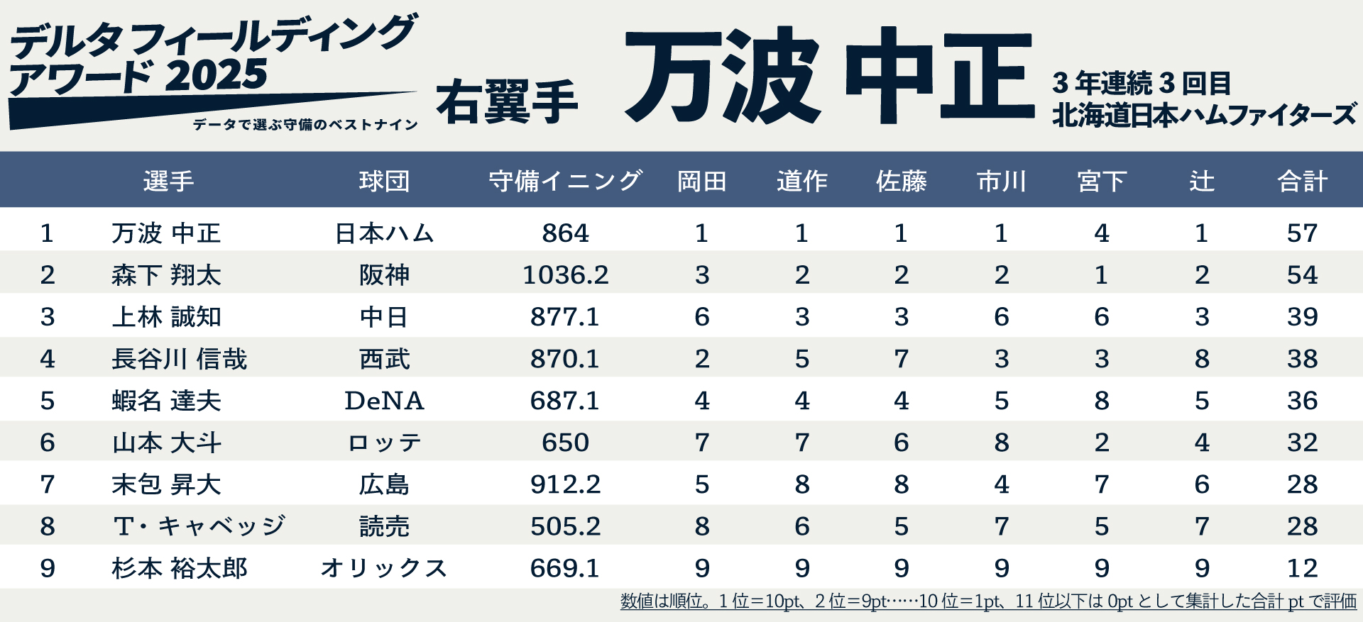 右翼手部門は万波中正(日本ハム)が57ポイントを獲得しての受賞となりました。1位票を6人中5人から集め、これで受賞は3年連続です。アナリスト市川博久氏は万波の10点以上プラスを稼いだ守備範囲を高く評価しています。道作氏は「まだ25歳であることからどこまで継続できるのか注目したい」とコメント。右翼手として確固たる地位を築き上げています。