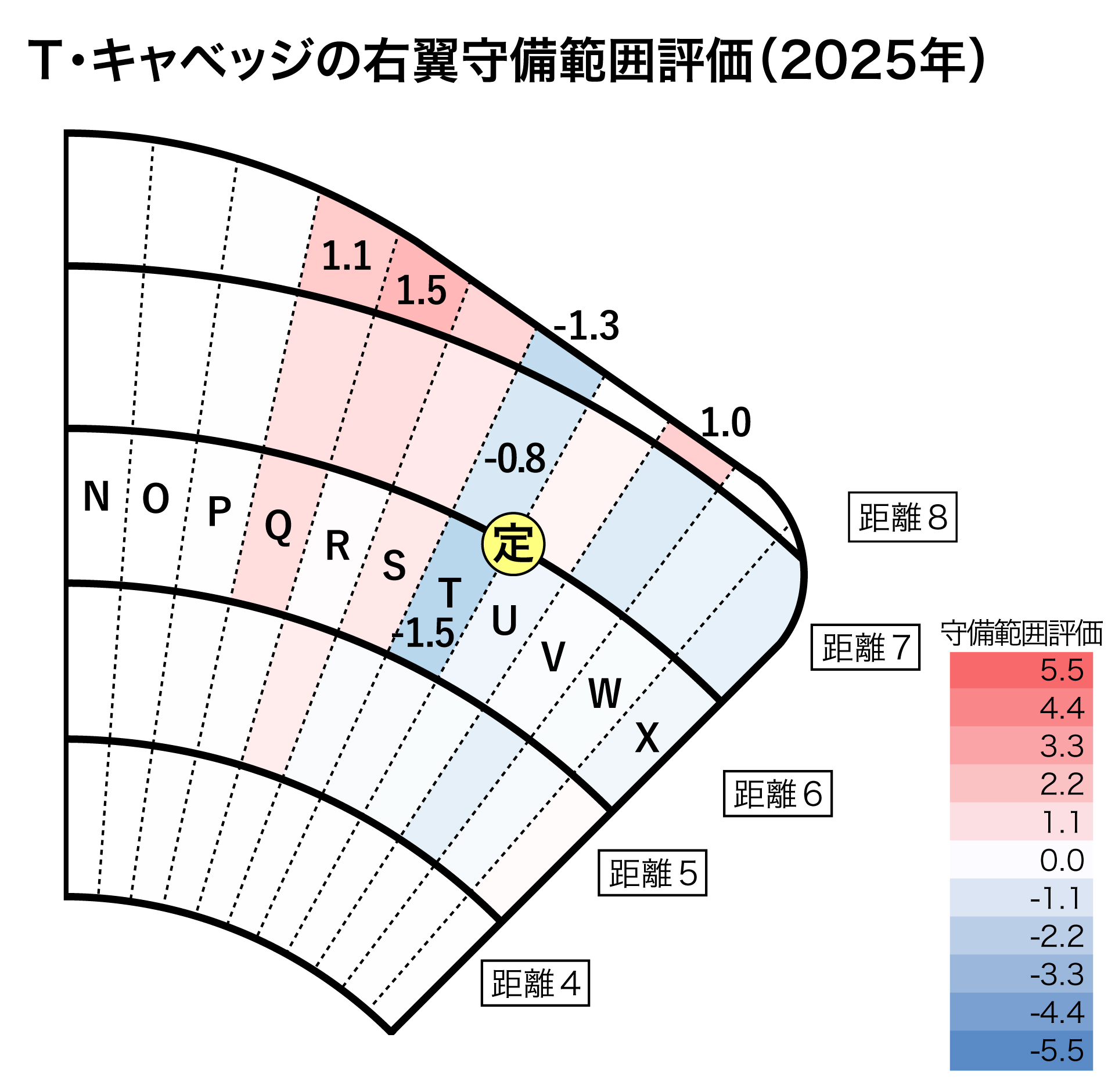 トレイ・キャベッジ(読売)は505.2イニングを守り、守備範囲評価が1.2。詳しく見ると、右中間寄りの打球処理で多くの失点を防いでいるようです。しかし、定位置周辺と右翼線寄りの打球処理で失点を増やしてしまいました。前方、後方の打球に関しては得意・不得意の傾向はみられません。守備位置が通常の選手より右中間寄りである可能性も考えられます。