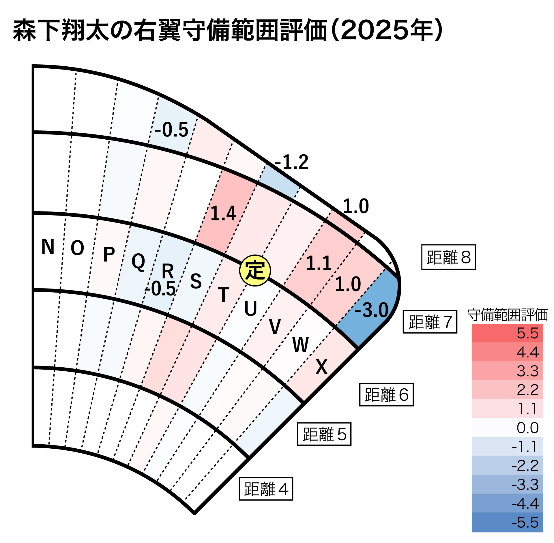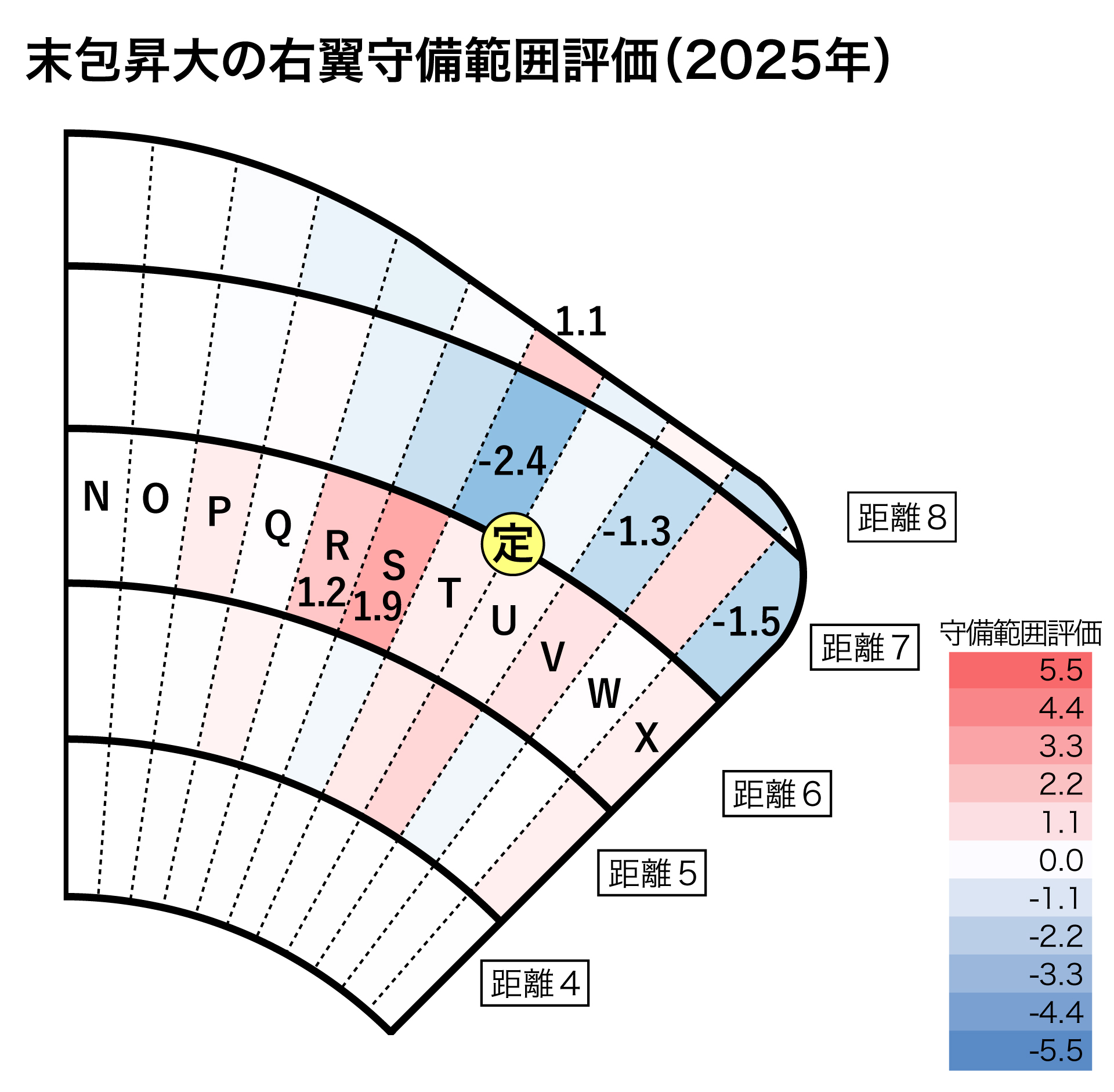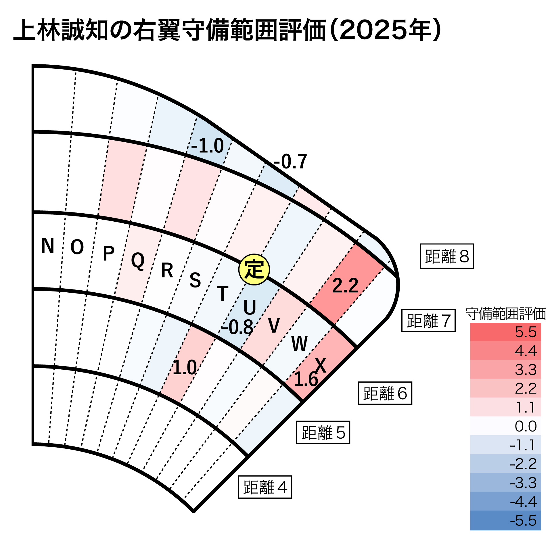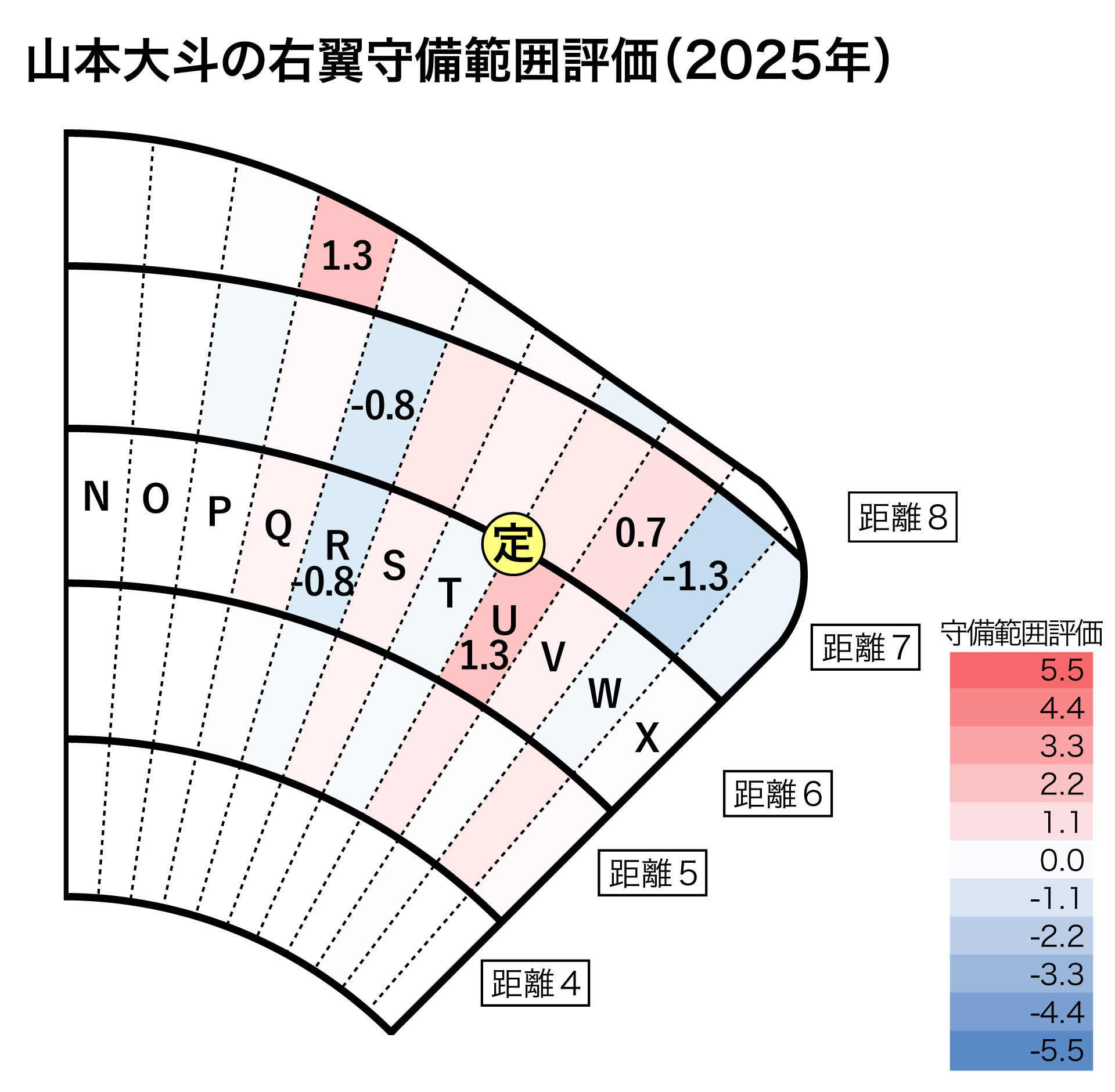 各選手が具体的にどのような打球を得意・不得意としているのか処理状況を確認していきましょう。以降の図の値は、平均的な右翼手と比較してそのゾーンの打球処理でどれだけ失点を防いだかを示します。黄色い円に「定」と書かれた印は、おおよその定位置を表しています。