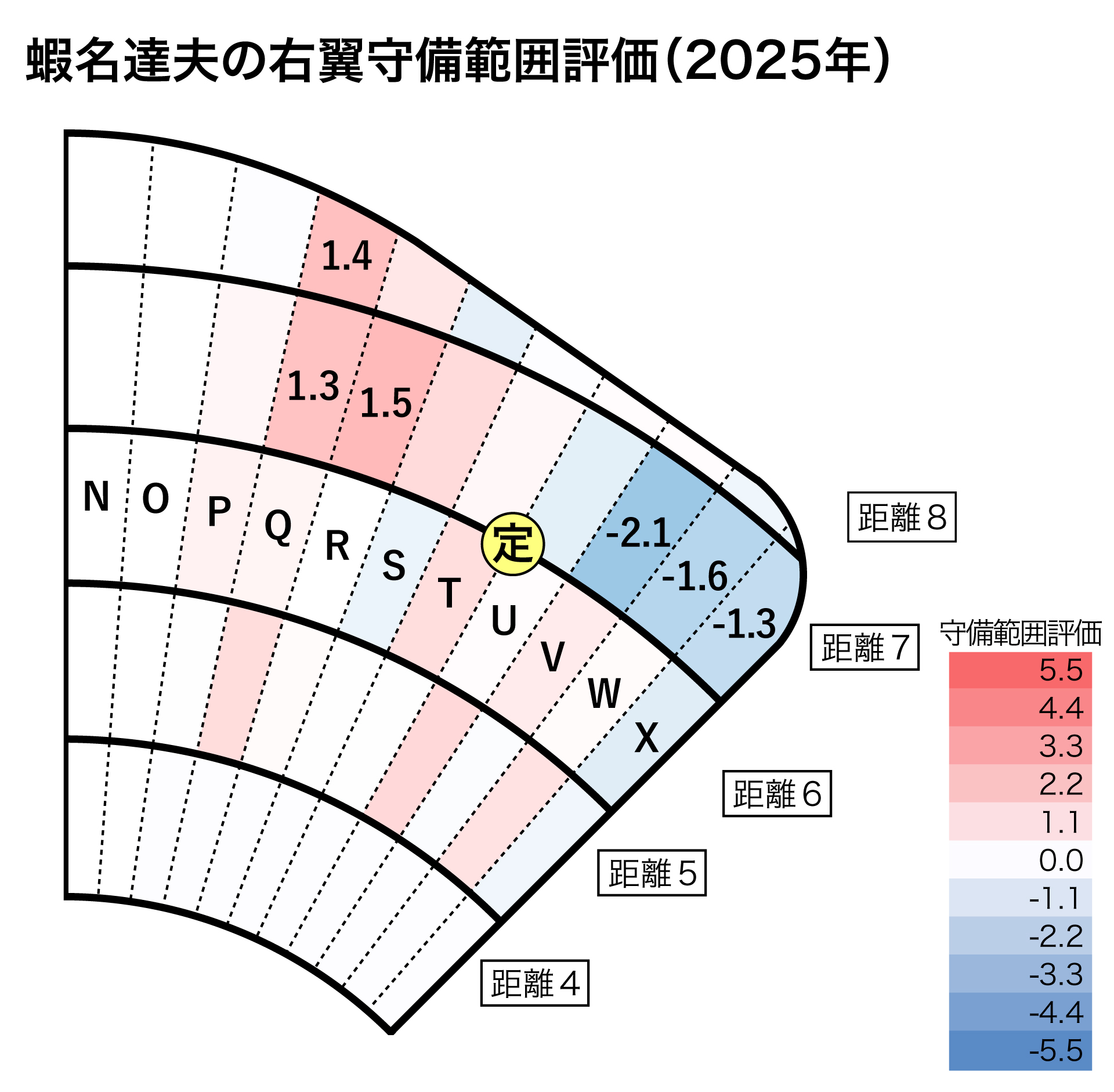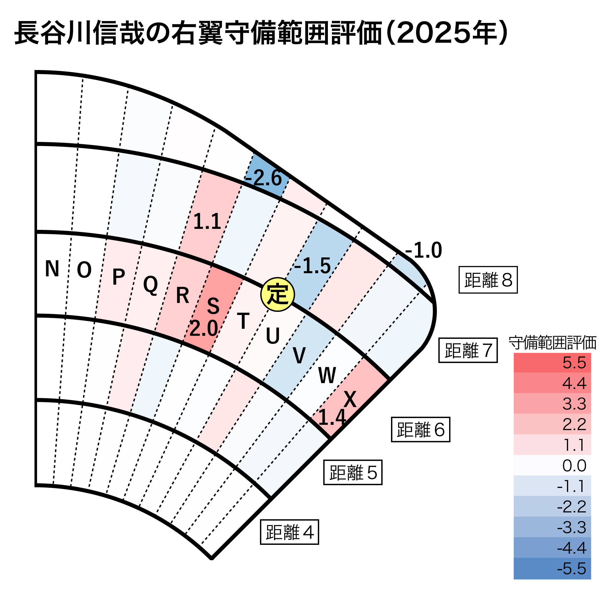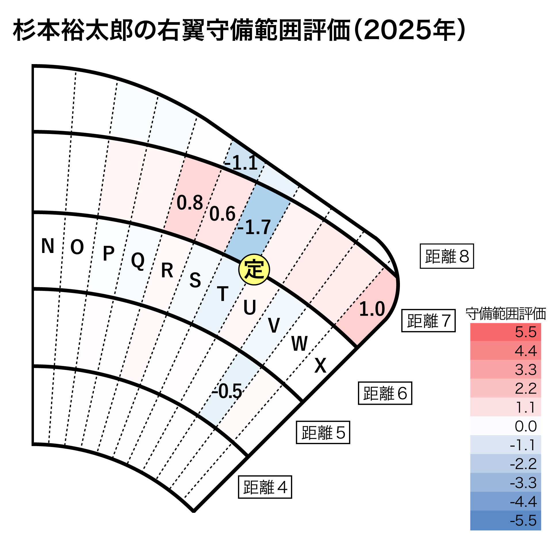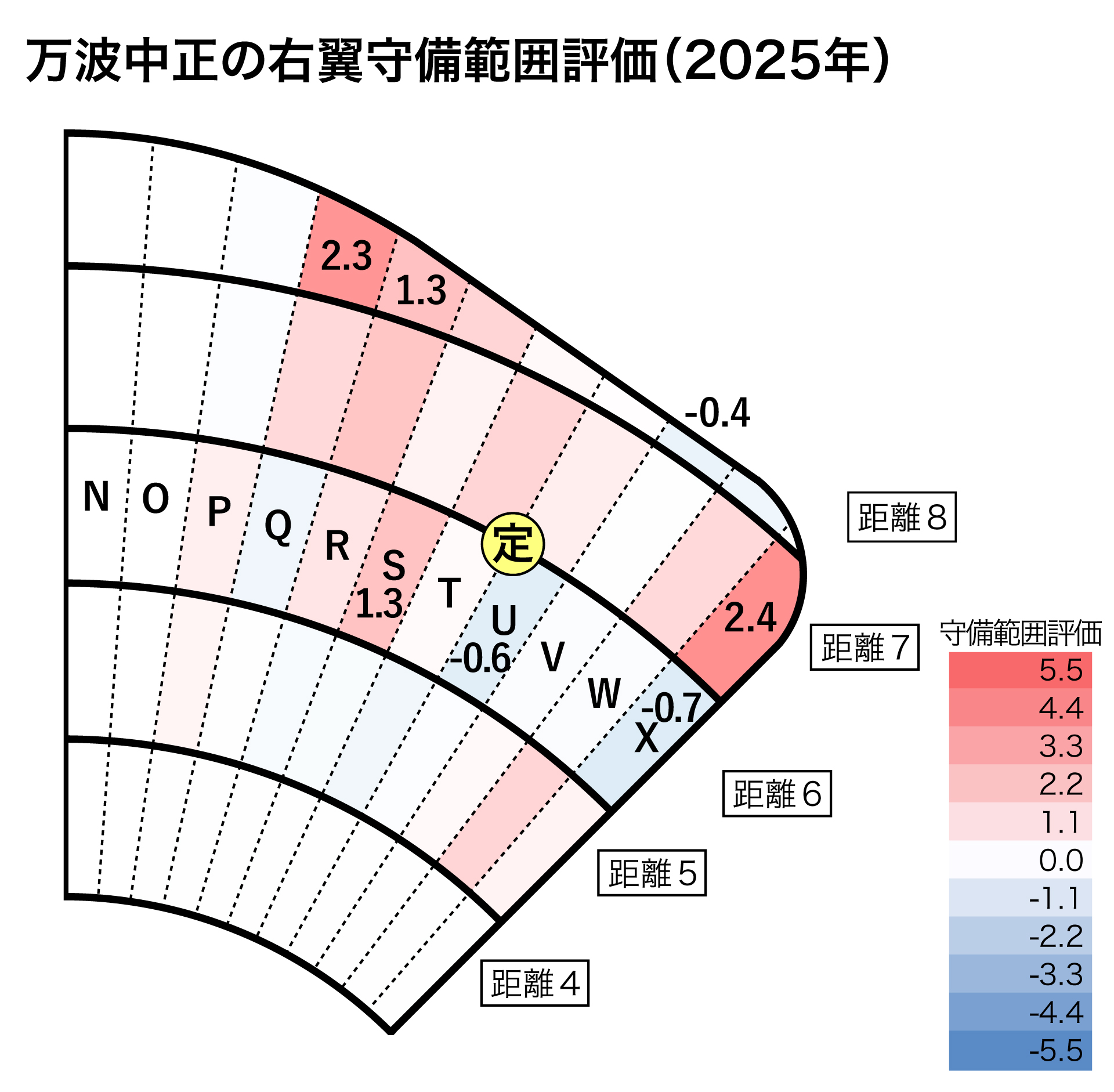 各選手が具体的にどのような打球を得意・不得意としているのか処理状況を確認していきましょう。以降の図の値は、平均的な右翼手と比較してそのゾーンの打球処理でどれだけ失点を防いだかを示します。黄色い円に「定」と書かれた印は、おおよその定位置を表しています。