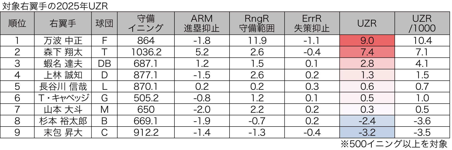 • 辻:守備範囲、失策、進塁抑止の3項目で評価。守備範囲は、打球の滞空時間とゾーンで分割して分析し、滞空時間の短い打球に対しては重みをつけて評価